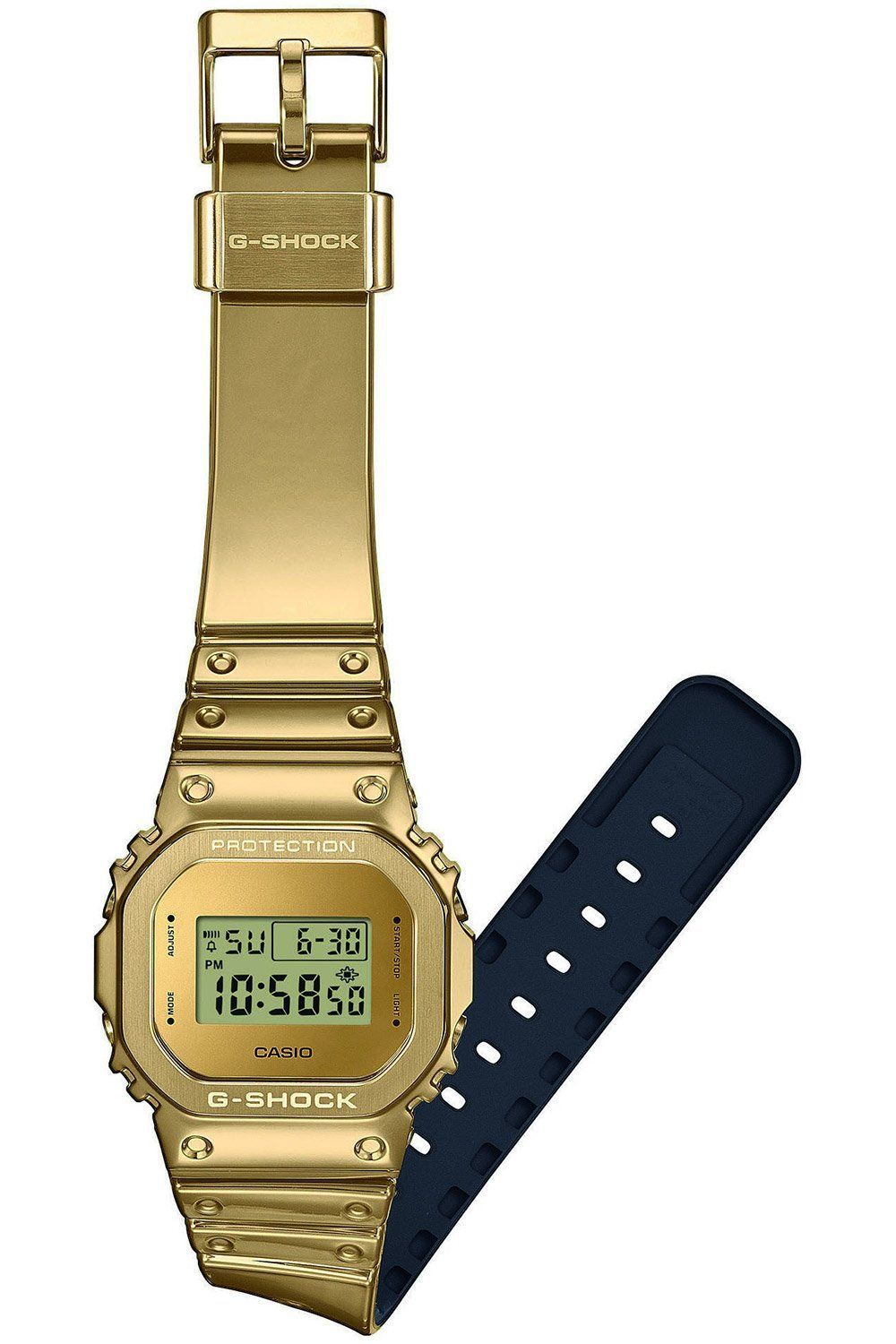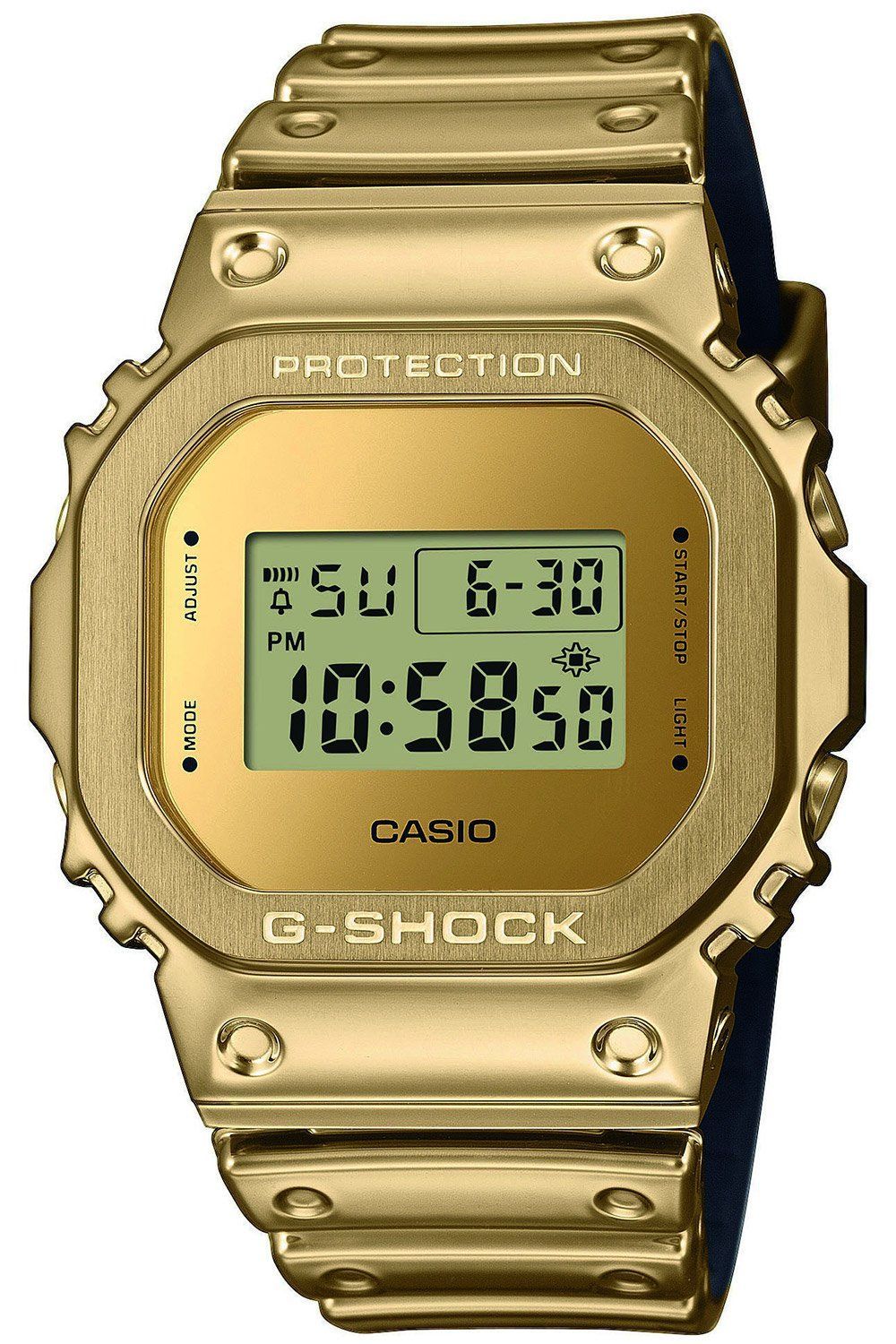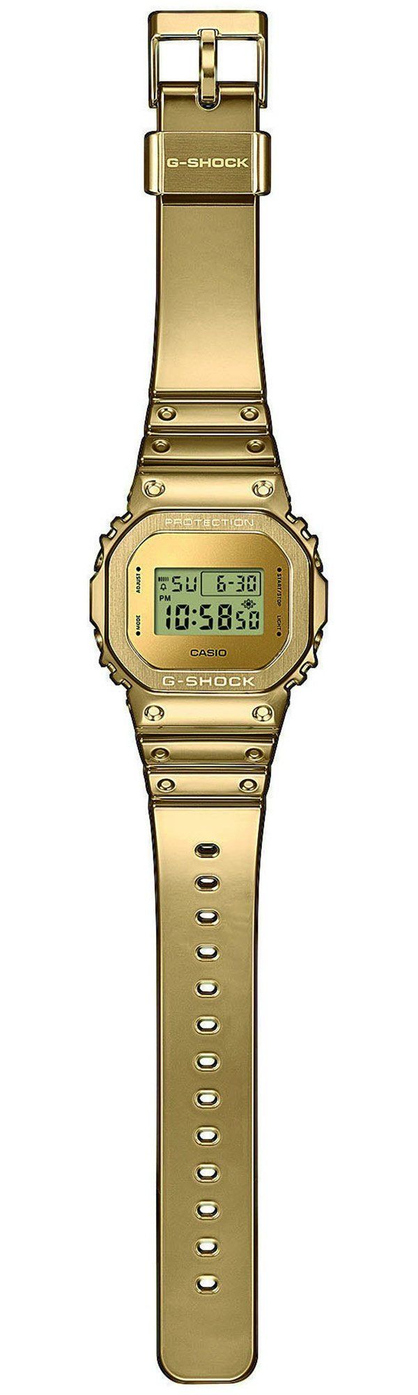 traumhafte Armbanduhr mit digitaler Anzeige, präzises Quarzwerk, Anzeige von Datum, Monat und Wochentag, automatischer Kalender, Zeitanzeige auf 12- oder 24-Stunden-Format einstellbar, Stoppfunktion bis zu 24 Stunden in 1/100-Sekundenschritten, Countdown-Timer im Sekundentakt bis zu 24 Stunden, Multifunktionsalarm, LED Display Flasher bei Erreichen z.B. eines Alarms, Hintergrundbeleuchtung, goldfarbene Display-Umrandung, goldfarbenes Resin-Gehäuse mit einer Lünette aus Edelstahl, stoßfest, gesch