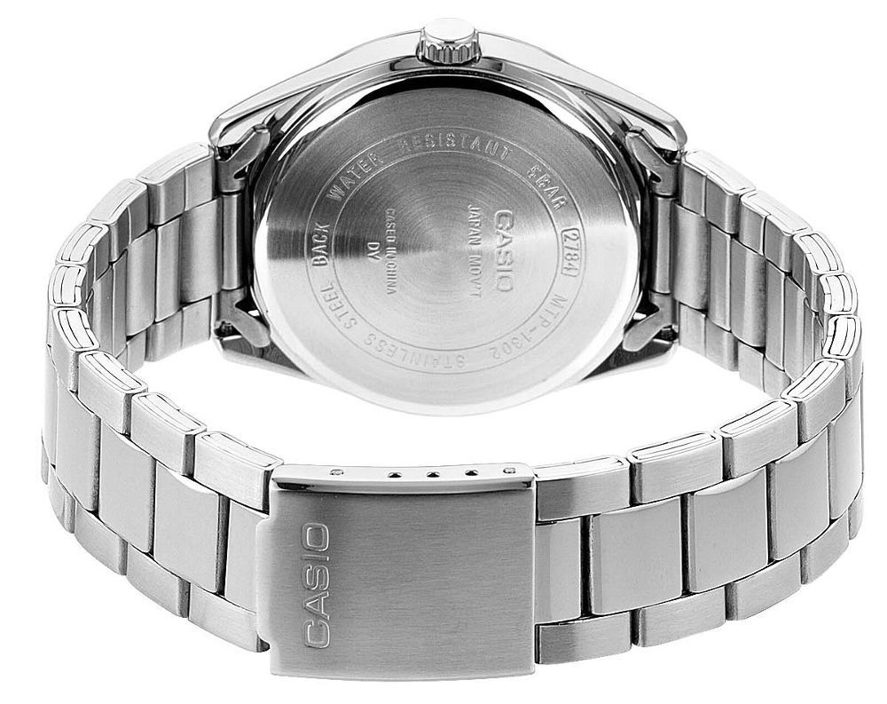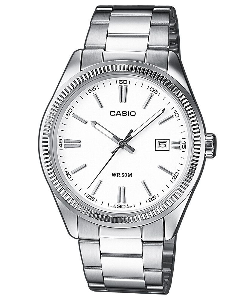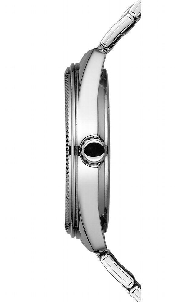 poliertes Messinggehäuse, geriffelte Krone, Mineralglas, Armband aus mattiertem Edelstahl, mittig poliert, Faltschließe mit Logo, präzises Quarzwerk, Datumsanzeige, weißes Zifferblatt, lumineszierende Zeiger, polierte Indizes, zentraler Sekundenzeiger, wasserdicht bis 5 bar, Durchmesser 38,5 mm, Höhe 9,2 mm