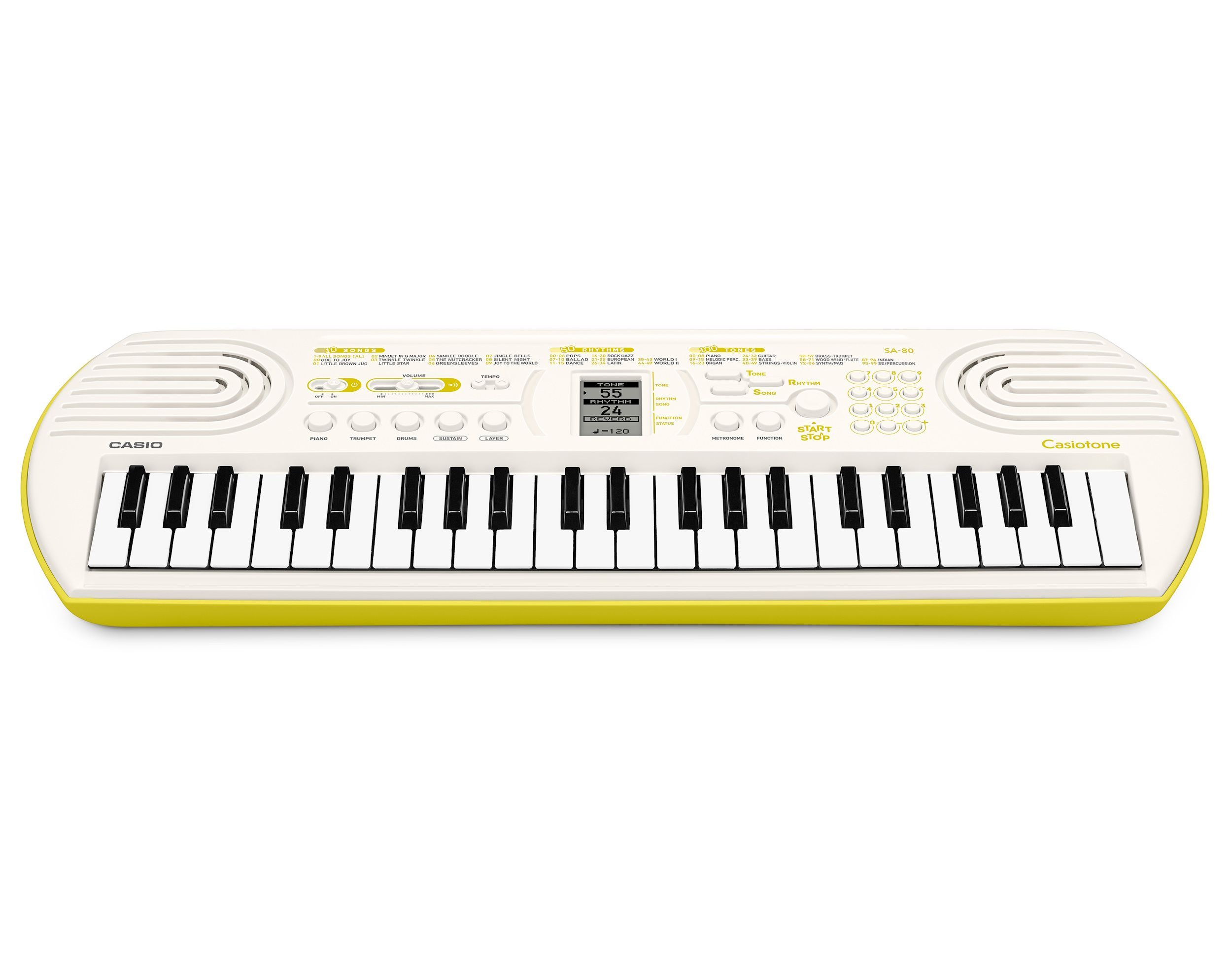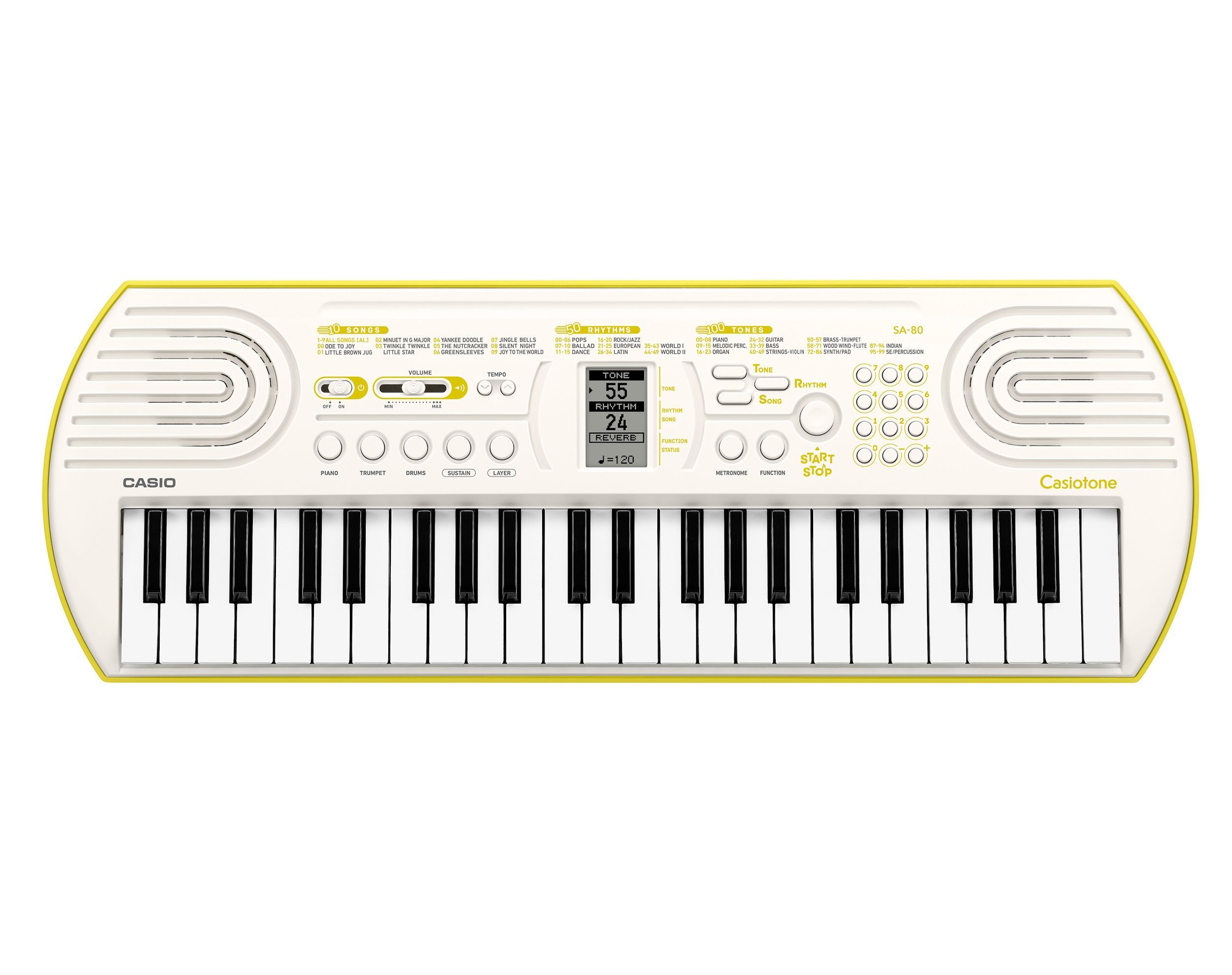 Casiotone SA-80 Die perfekte Wahl für Ihr erstes Tasteninstrument. Ein kompaktes Keyboard mit großartigen Sounds, Rhythmen und Funktionen! Die Features des Casiotone SA-80: 44 Minitasten 100 Töne 50 Rhythmen Muster 10 integrierte Songs Lektionen Funktion: Melodie aus 32-fache Polyphonie LCD-Display