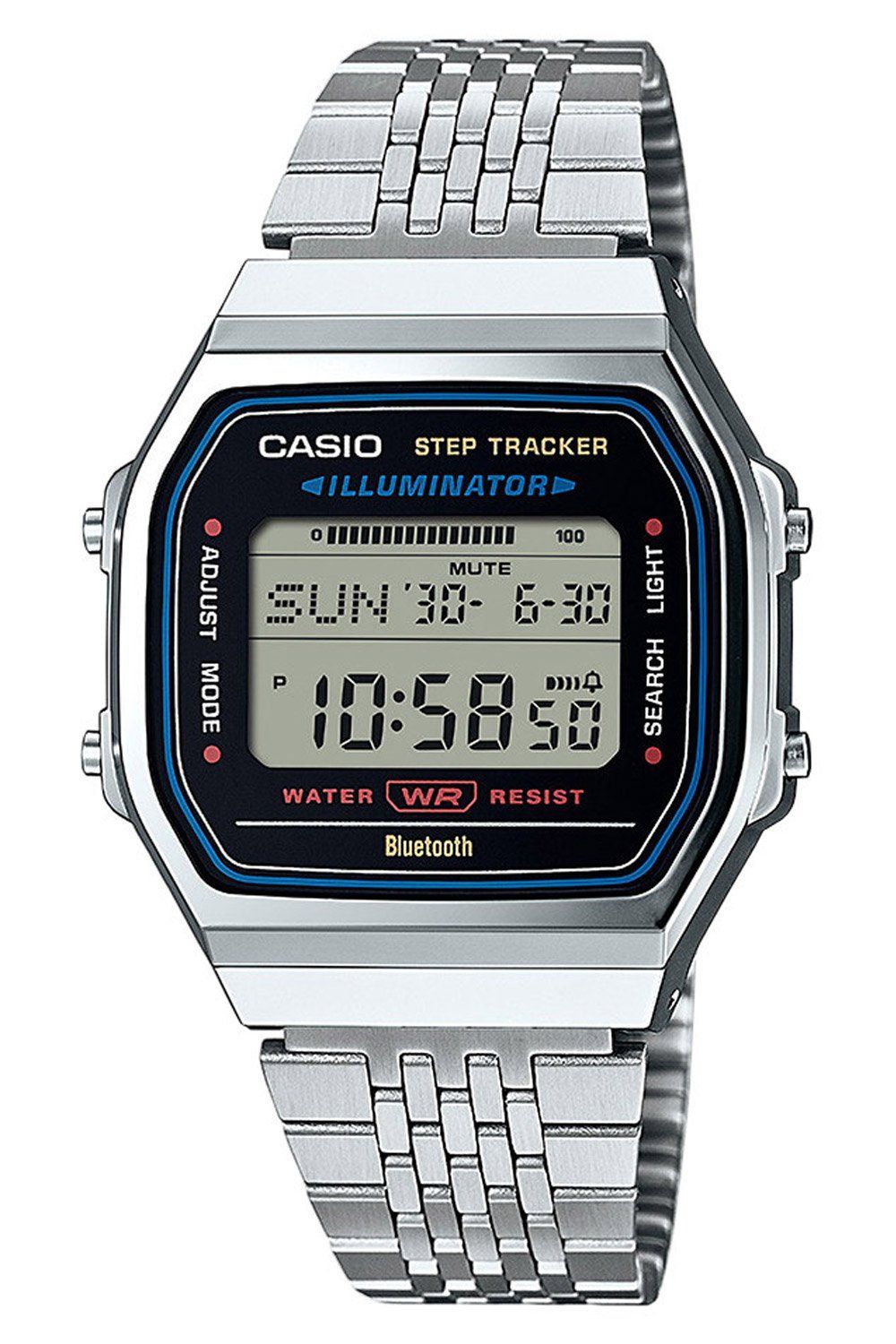 nostalgische Armbanduhr in Unisexgröße, via Bluetooth mit dem Smartphone koppelbar, automatische Zeiteinstellung, präzises Quarzwerk, digitale Anzeige von Uhrzeit, Datum und Wochentag, Zeitanzeige auf 12- oder 24-Stunden-Format einstellbar, automatischer Kalender zeigt immer das richtige Datum an, Anzeige einer zweiten Uhrzeit, Weltzeit-Funktion, Stoppfunktion mit 1/100-Sekundenschritten bis zu 24 Stunden, misst Zwischen- und Rundenzeit, Countdown Timer bis zu 60 Minuten in Sekundenschritten, 5