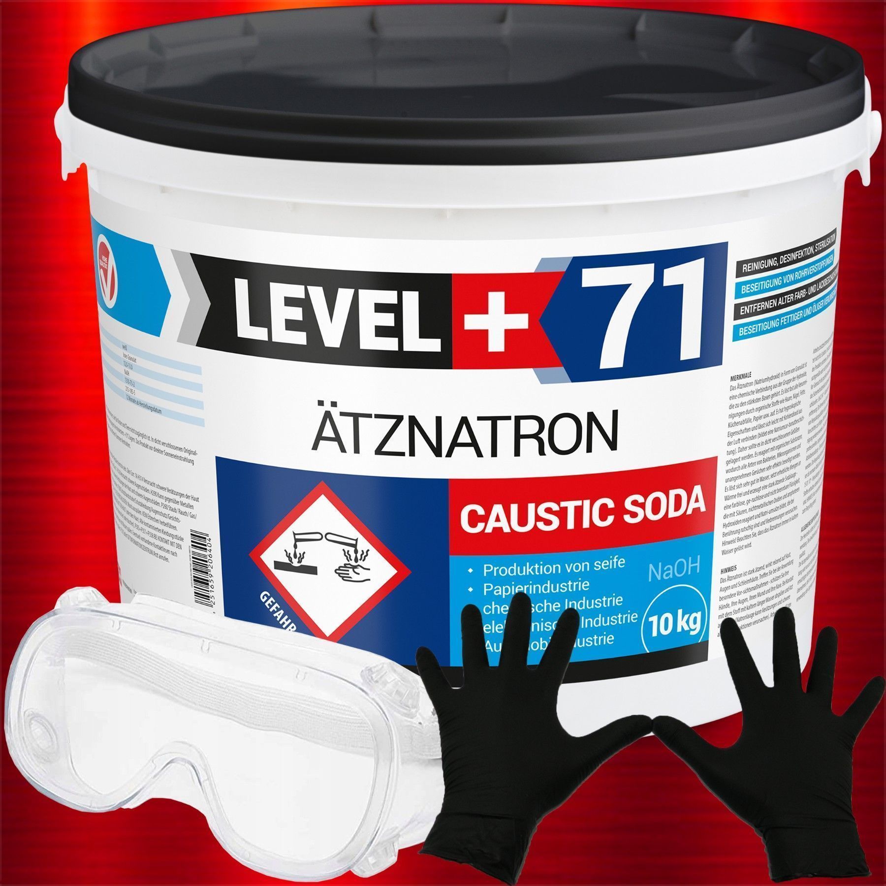 Caustic Soda Rohrreiniger 10kg Eimer Seifenindustrie + Schutzbrille + Handschuhe RM71