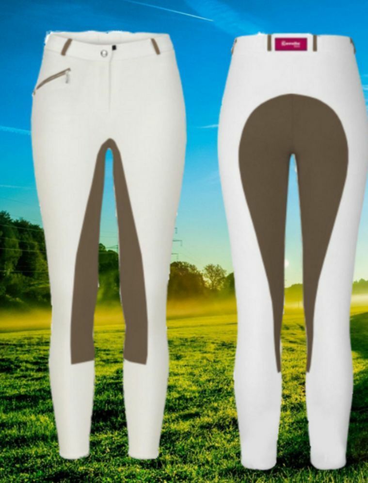 CAVALLO Reithose Cathy in weiß-walnut • Modische Kinderreithose • 3 4 Vollbesatz aus Cavasoft • Farbe: weiß • Besatzfarbe: walnut • sehr weich und elastisch • niedrige Leibhöhe • Reißverschlusstasche vorne • Beinabschluss mit Klett • ohne Seitennaht &bull