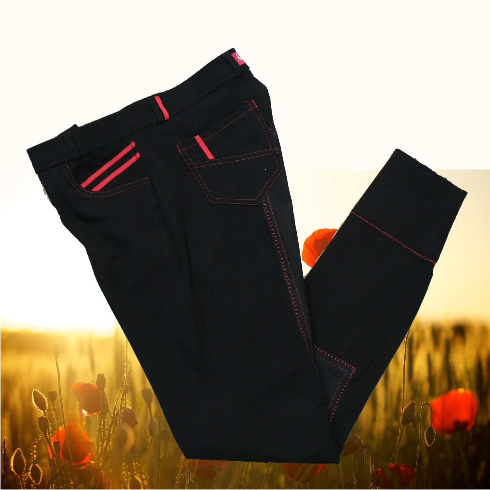 CAVALLO Kinderreithose Chiara in schwarz · Modische Kinderreithose · 3 4 Vollbesatz aus Cavasoft · Farbe: schwarz · Mit kontrastfarben Nähten · sehr weich und elastisch · niedrige Leibhöhe · Reißverschlusstasche vorne · Beinabschluss mit Klett