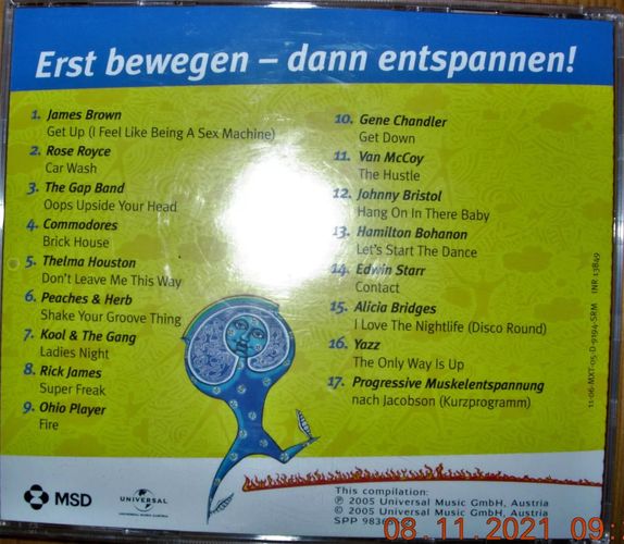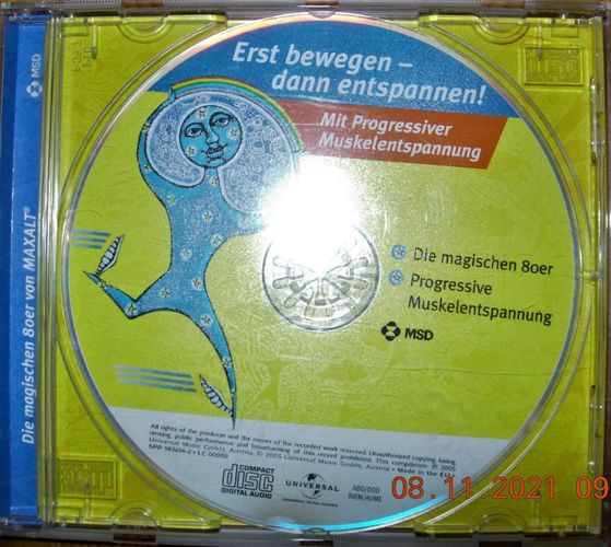 Sie bieten auf das CD-Album Erst bewegen - dann entspannen Die magischen 80er & Progressive Muskelentspannung nach Jacobson (Kurzprogramm) . Mit einem Startpreis von 1 €uro ein echtes Schnäppchen! Trackliste Die Trackliste entnehmen Sie bitte Foto 2!