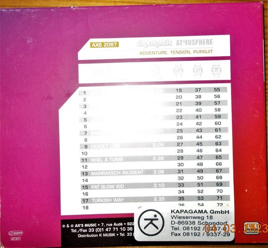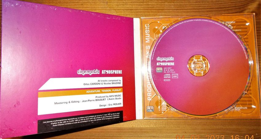 Sie bieten auf das CD-Album Cinematic Atmosphere von Gilles Cardoni & Nicolas Baudino aus dem Genre Electronic Stage & Screen. Das sind 72 Tracks auf einer CD. Die 18 Tracks jeweils in einer Normallänge und dann jeweils als 30-Sekunden, 20-Sekunden - und als 10 Sekunden-Version. Bei einem &e