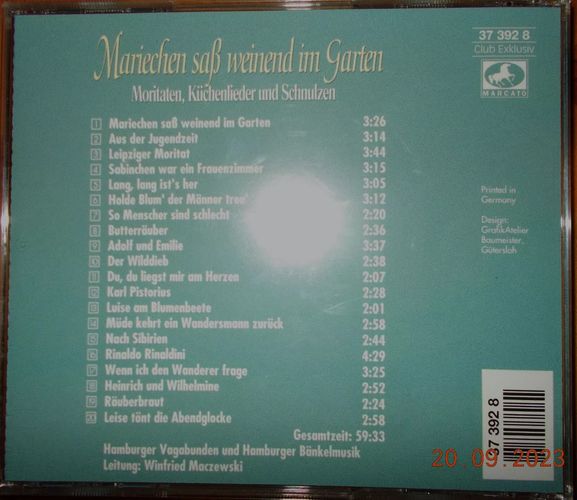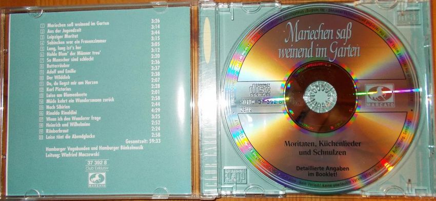Sie bieten auf das CD-Album Mariechen Saß Weinend Im Garten aus dem Genre Moritäten, Küchenlieder, Schnulzen . Mit einem Startpreis von 1 €uro ein echtes Schnäppchen! Und: Die CD scheint selten zu sein, hab sie im Internet nirgens gefunden. Sie können Versandkosten sparen, indem Sie mehrere CDs