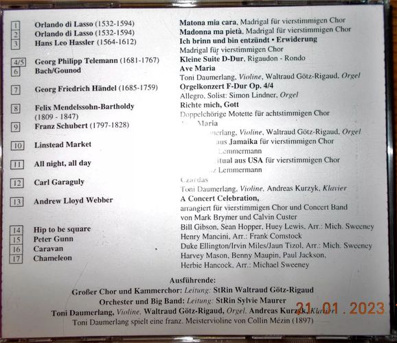 Sie bieten auf die Klassik Pop-CD Musik am Cornelius Gymnasium Deggendorf . Bei einem €uro Startgebot ein echtes Schnäppchen! Und: sparen Sie Versandkosten, indem Sie noch weitere CDs von mir ersteigern! Trackliste : Beachten Sie hierzu bitte das Foto 5