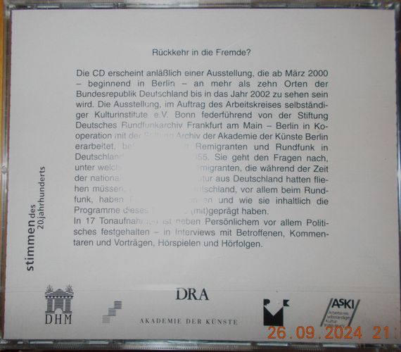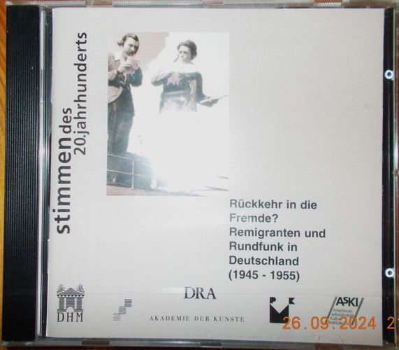 Sie bieten auf die CD Rückkehr In Die FremdeEuro, Remigranten und Rundfunk in Deutschland (1945 - 1955) . Die CD ist NEU, also noch in Folie eingeschweisst. Bei einem €uro Startgebot ein echtes Schnäppchen! Und: sparen Sie Versandkosten, indem Sie noch weitere CDs von mir ersteigern! Trackliste