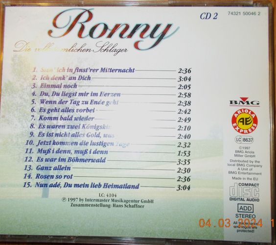 Sie bieten auf das CD-Album Seine Größten Erfolge, Die Volkstümlichen Schlager, CD 2 von Ronny . Mit einem Startpreis von 1 €uro für diese beiden CDs ein echtes Schnäppchen! Und: sparen Sie Versandkosten, indem Sie noch weitere CDs von mir ersteigern! Trackliste 1 Steh' Ich In Finst'rer Mittern