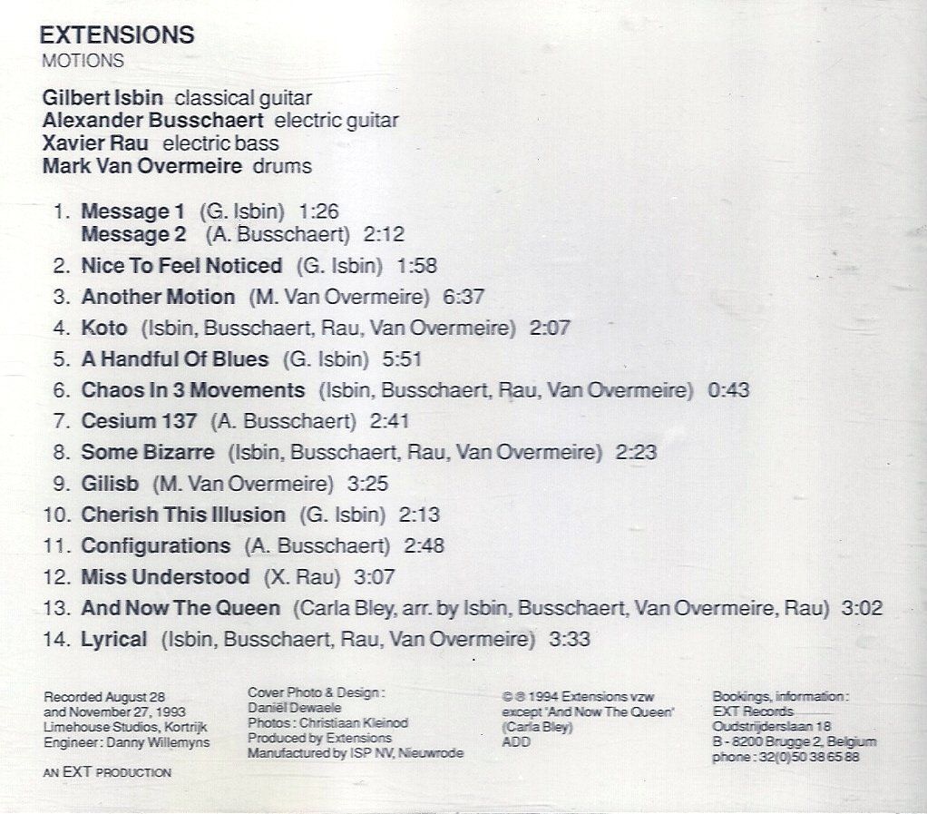 Künstler/in: Extensions Titel: Motions Label: EXT Records Jahr: 1994 Format: CD Gewicht: 200 g Katalog-Nr.: EXT 001 Zustand: Neuware ohne Folie