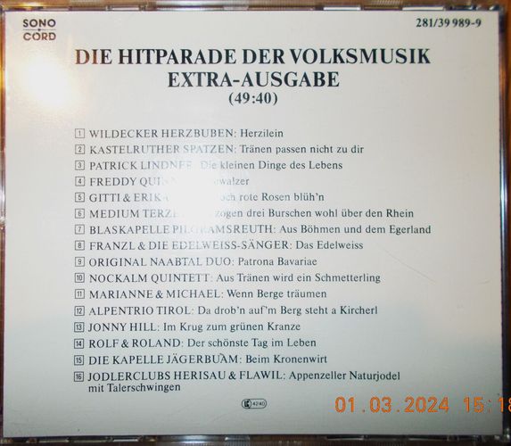 Sie bieten auf die Sampler-CD Die Hitparade Der Volksmusik, Extra-Ausgabe . Bei einem €uro Startgebot ein echtes Schnäppchen! Und: sparen Sie Versandkosten, indem Sie noch weitere CDs von mir ersteigern! Trackliste 1 Wildecker Herzbuben – Herzilein 3:33 2 Kastelruther Spatzen – Trän