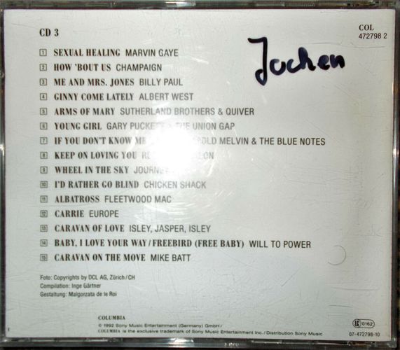 Sie bieten auf die Sampler-CD Schmusesongs Vol. 1, CD 3 . Bei einem €uro Startgebot ein echtes Schnäppchen! Und: sparen Sie Versandkosten, indem Sie noch weitere CDs von mir ersteigern! Trackliste 3-1 Marvin Gaye – Sexual Healing 3:58 3-2 Champaign – How Bout Us 4:33 3-3 Billy Paul