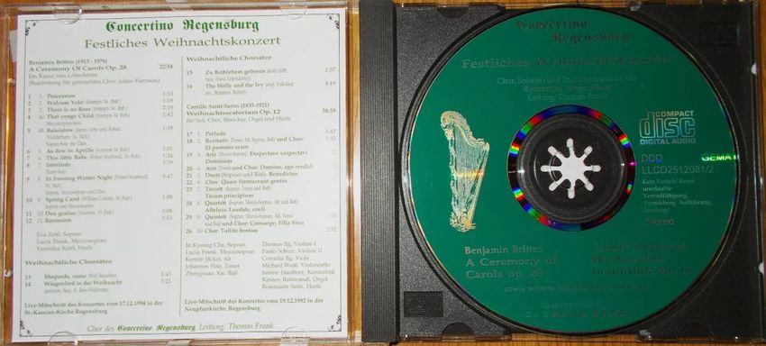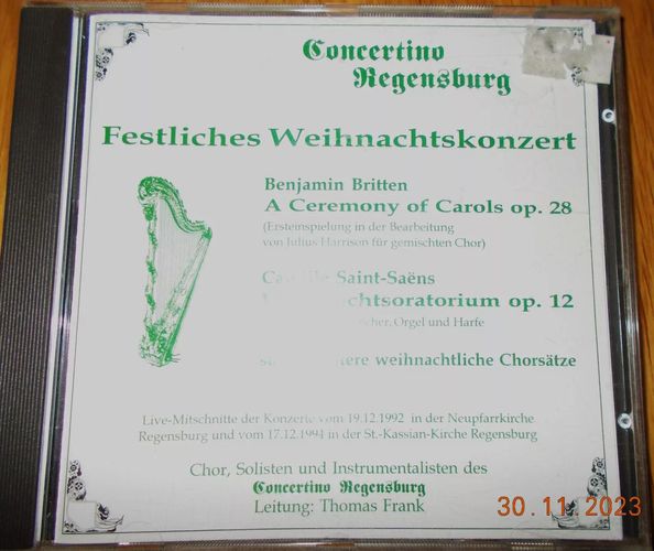 Sie bieten auf das CD-Album Festliches Weihnachtskonzert vom Concertino Regensburg . Das sind 26 Tracks auf einer CD. Bei einem €uro Startgebot ein echtes Schnäppchen! Und: sparen Sie Versandkosten, indem Sie noch weitere CDs von mir ersteigern! Trackliste