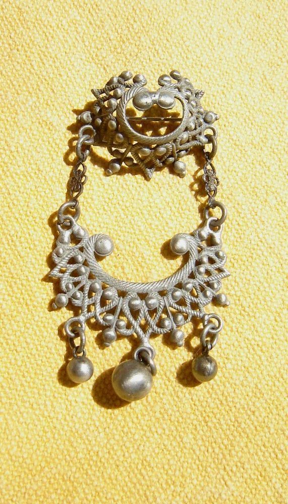. Trachtenschmuck , Rockschmuck Charivari Brosche , Rockstecker aus Metall liebevoll filigran ausgearbeitet , alt Zinn Farben mit zwei beweglichen Teilen und drei Kugel Anhänger zum Anstecken am Revers , Rock oder an der Schürze mit einer Sicherheitsnadel ausgezeichnet verarbeitet , aus deutscher He