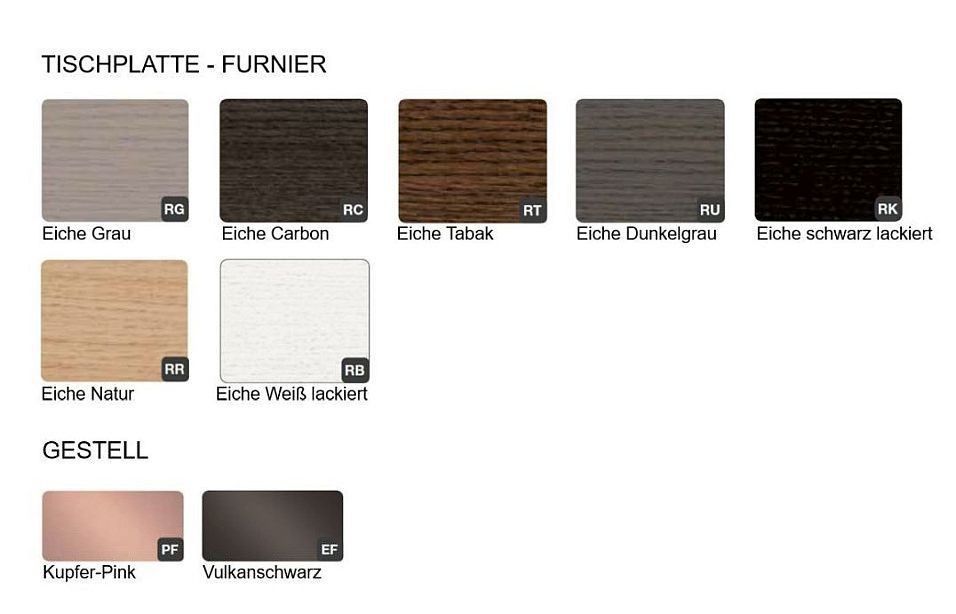Eiche Weiß lackiert (RB), Eiche Natur (RR), Eiche Grau (RG), Eiche Dunkelgrau (RU), Eiche Carbon (RC), Eiche Tabak (RT)