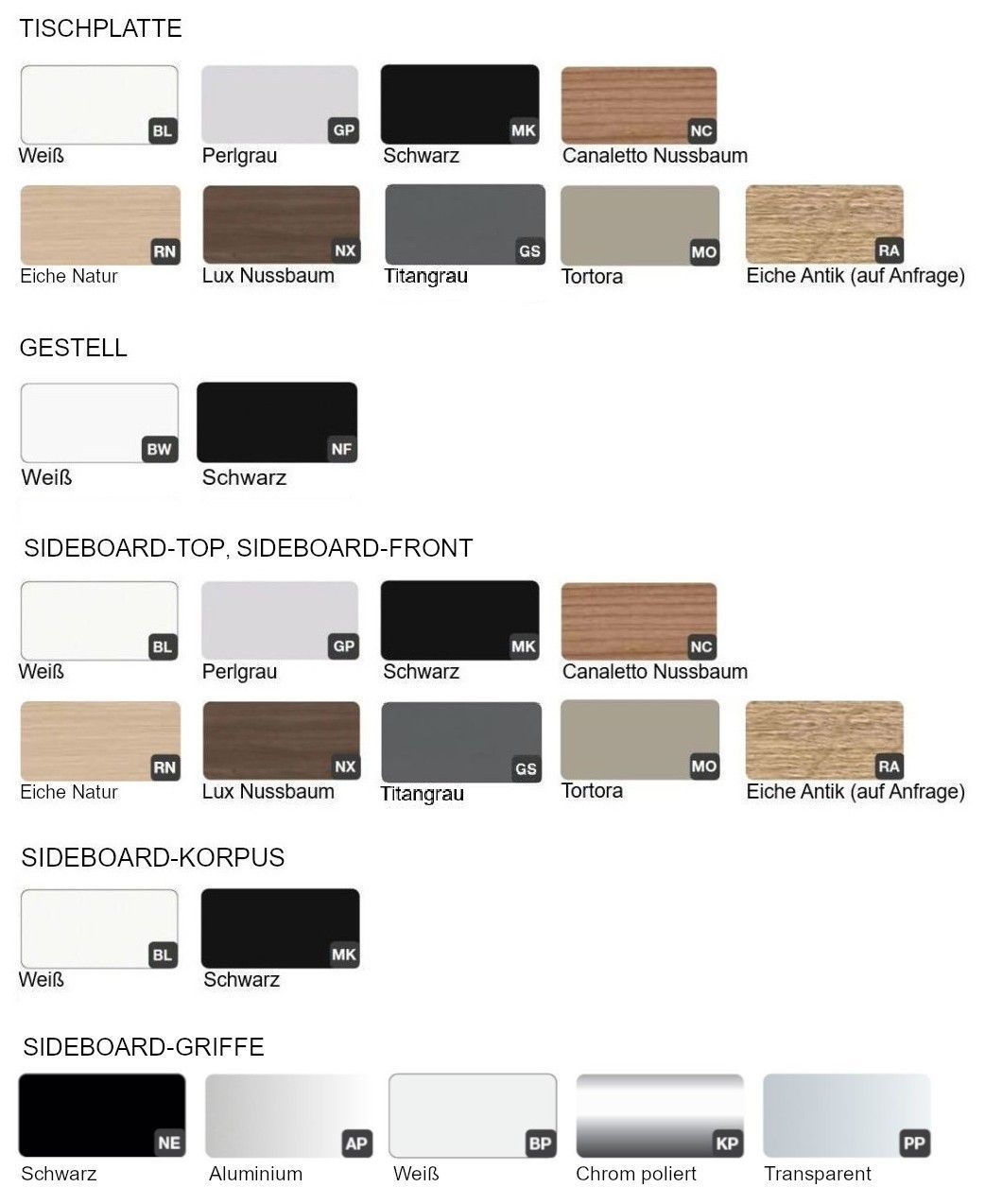 Weiß (BL), Perlgrau (GP), Tortora (MO), Titangrau (GS), Schwarz (MK), Eiche Natur (RN), Canaletto Nussbaum (NC), Lux Nussbaum (NX)
