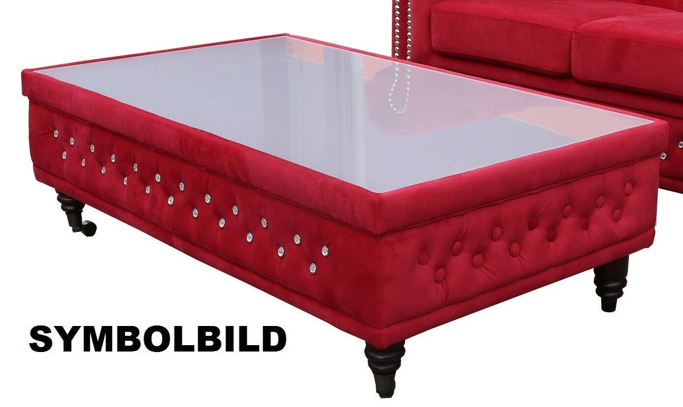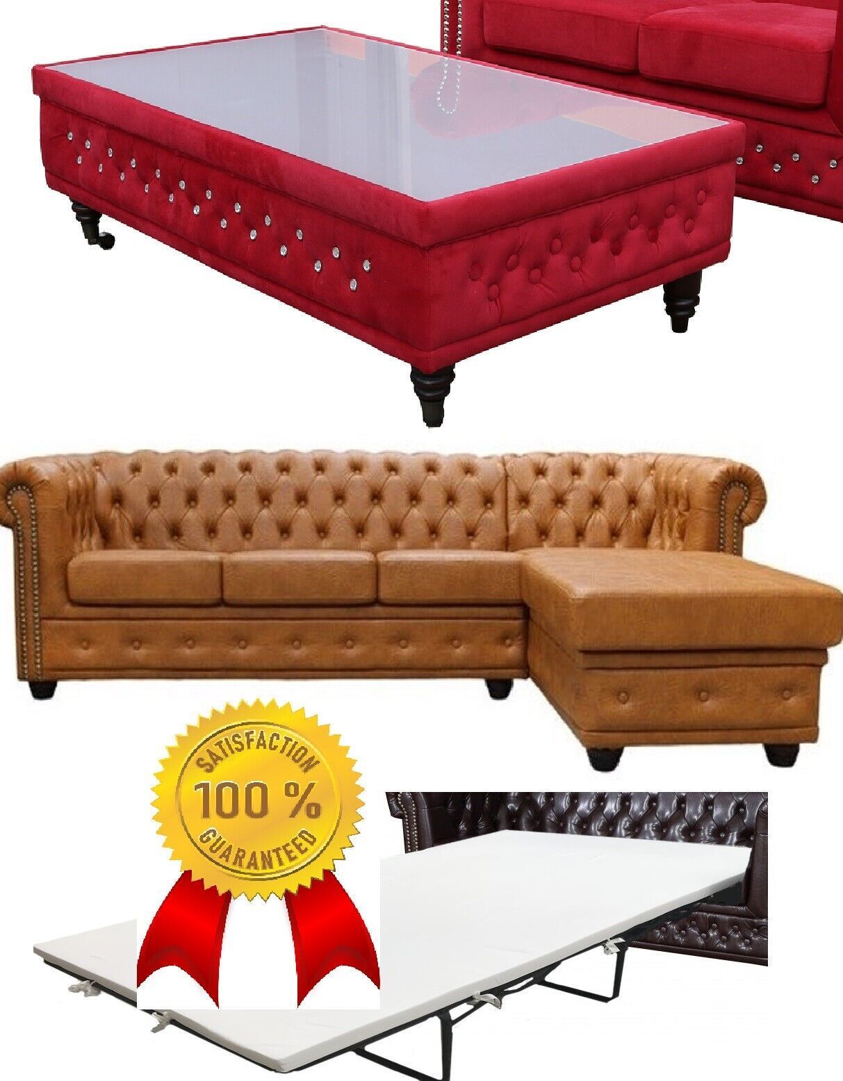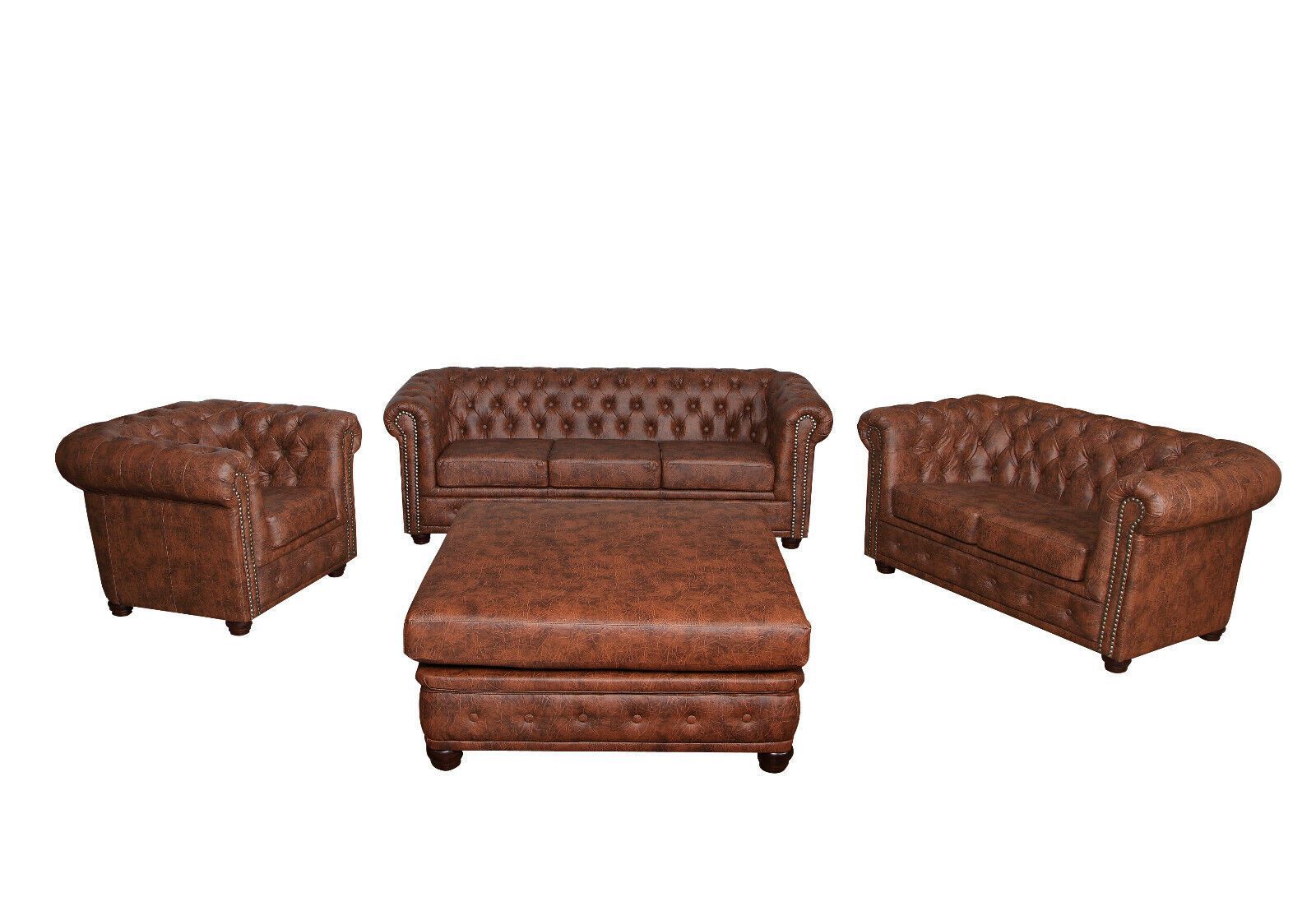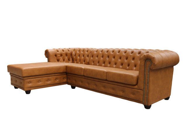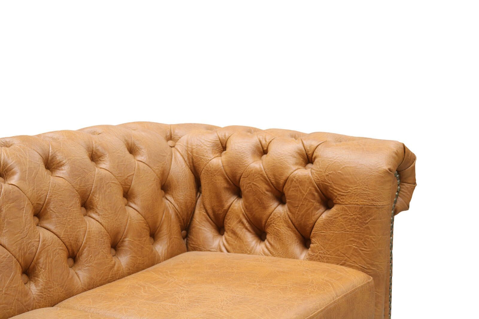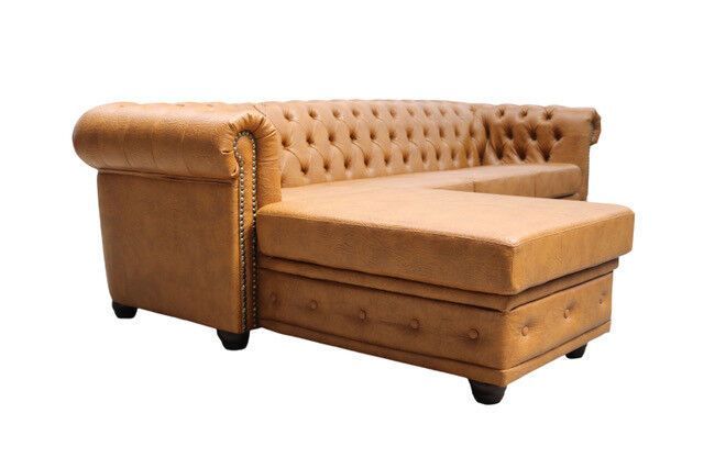 Chesterfield Ecksofa ottomane BETT 3 SITZER RETRO TISCH COGNAC L-FORM Kunstleder