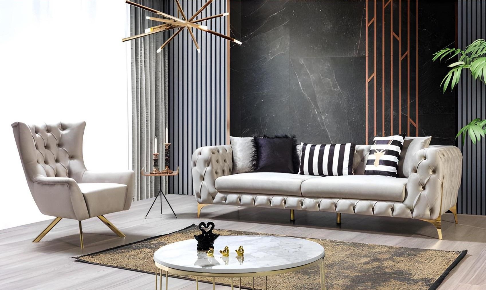 Chesterfield Hellgrauer Polsterssel Wohnzimmer Sessel Edelstahlfüße