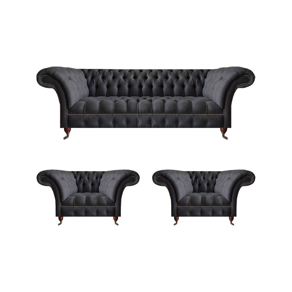 Chesterfield Schwarze Sitzgarnitur Wohnzimmer 3-Sitzer Couch 2x Sessel