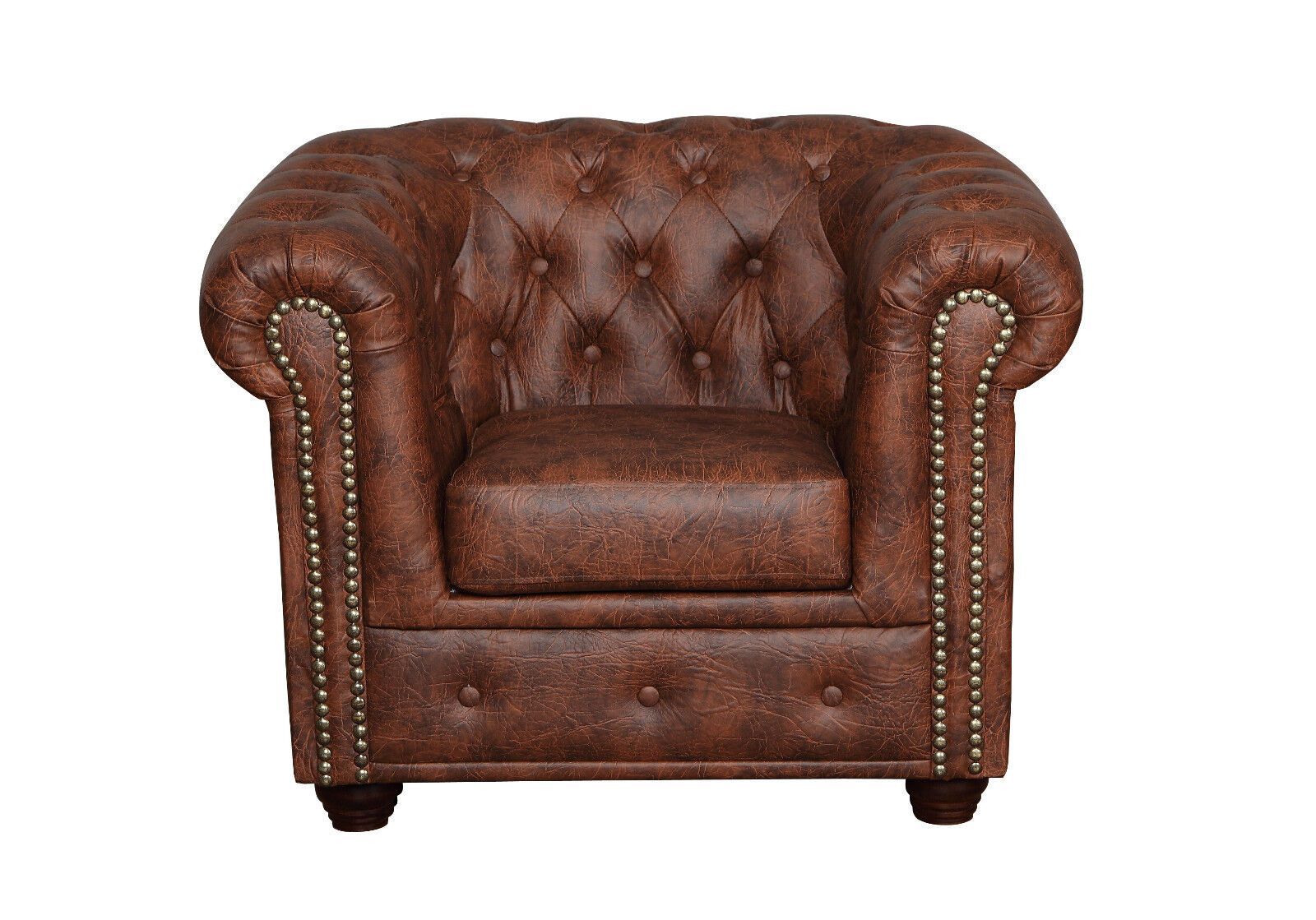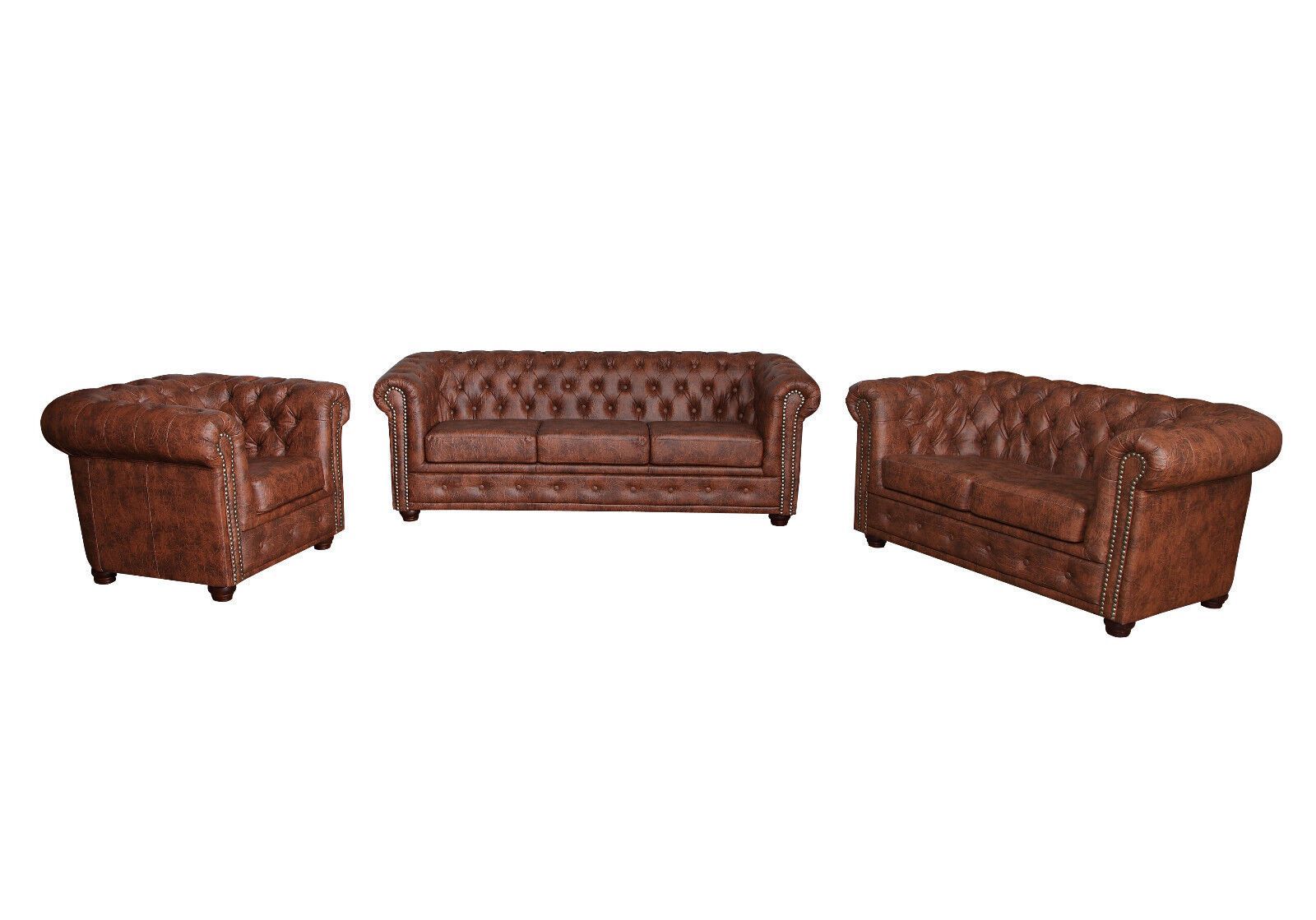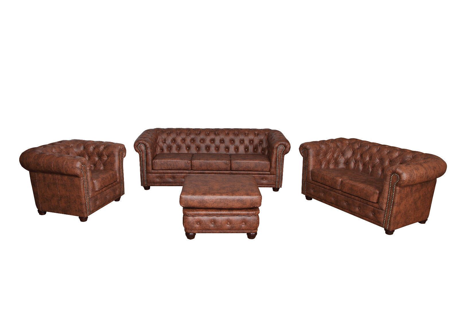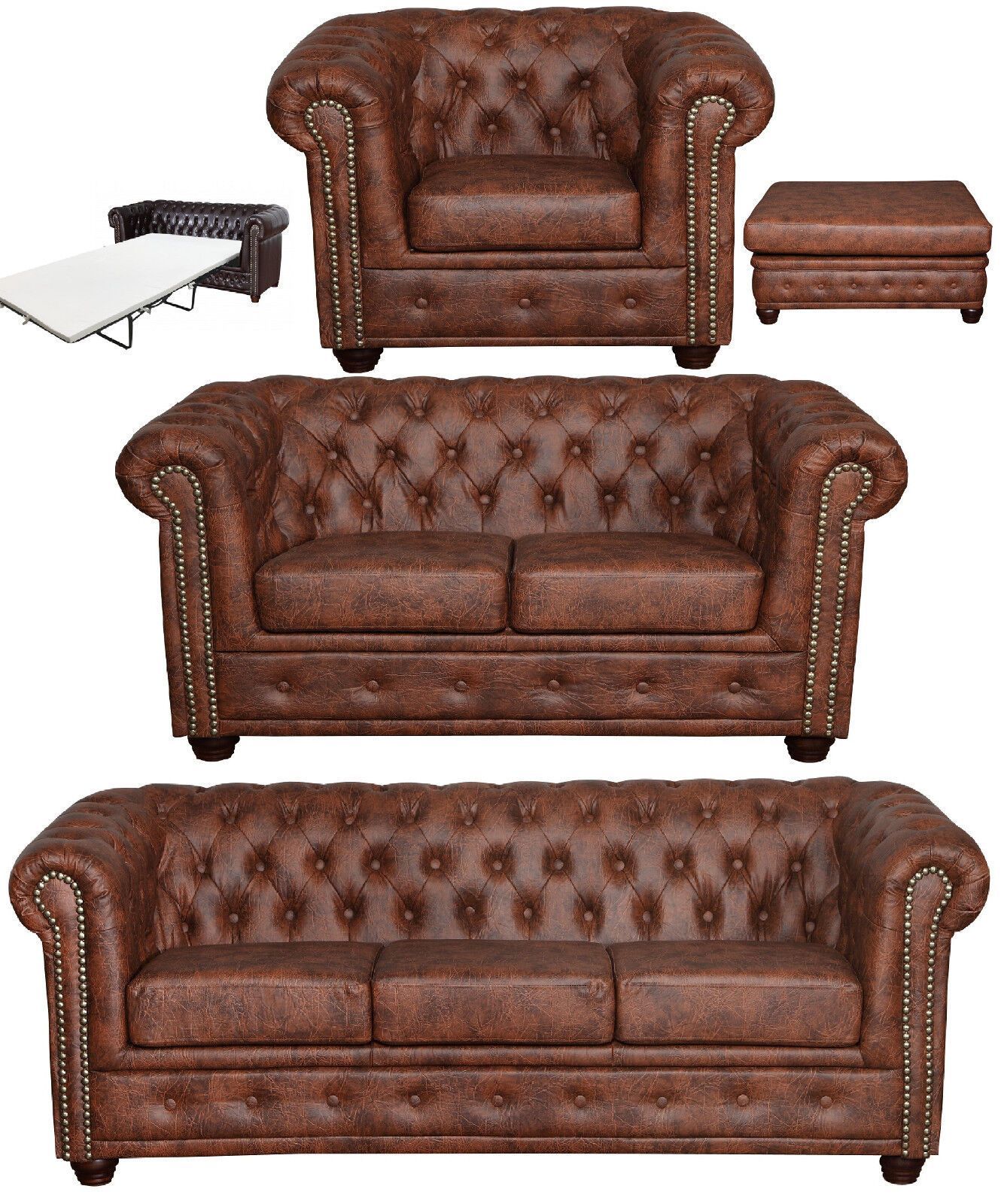 Chesterfield SET 1-2-3 SOFA SESSEL HOCKER Schlafsofa Industrie BRAUN Kunstleder