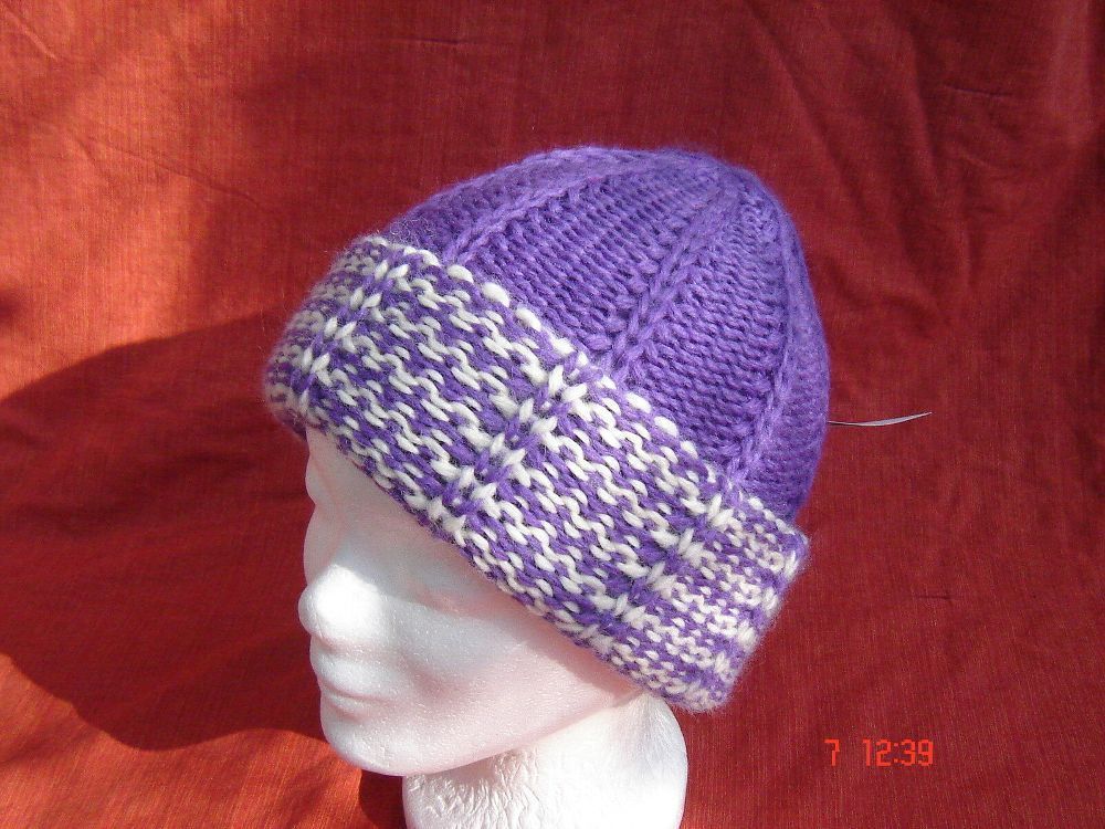 . chice oldstyle Wintermütze Strickmütze Umschlagmütze in Farbe lila mit weiß die Mütze ist sehr warm , da sie doppelt gestrickt ist und mit dem Umschlag hat man dann 4 Lagen um den Kopf herum aus 75% Wolle , 25% Polyacryl , Bitte Handwäsche Größe passend für 53 bis 55 cm Kopfumfang . Bitte sehen Si