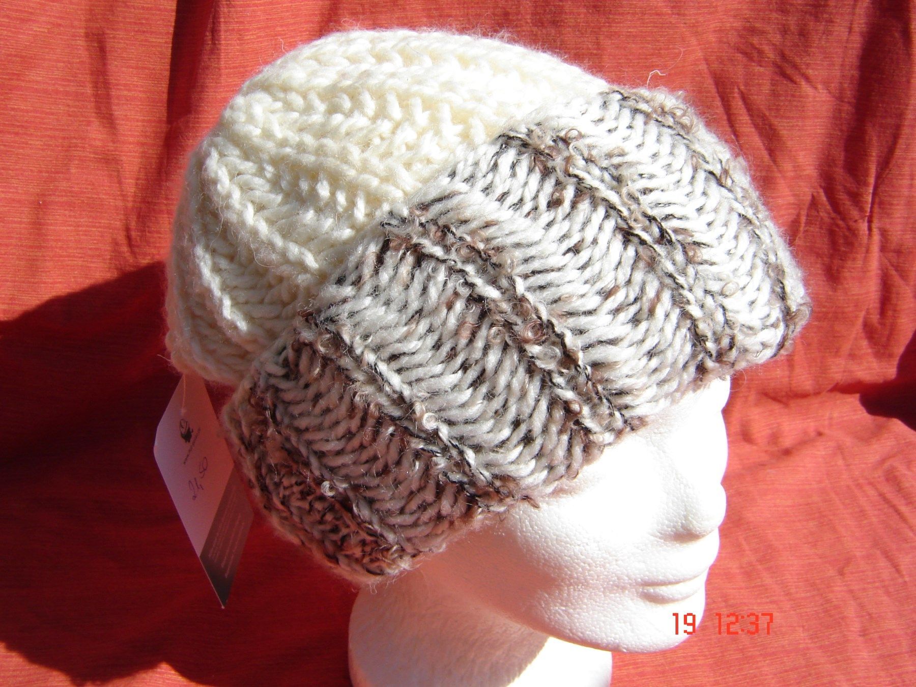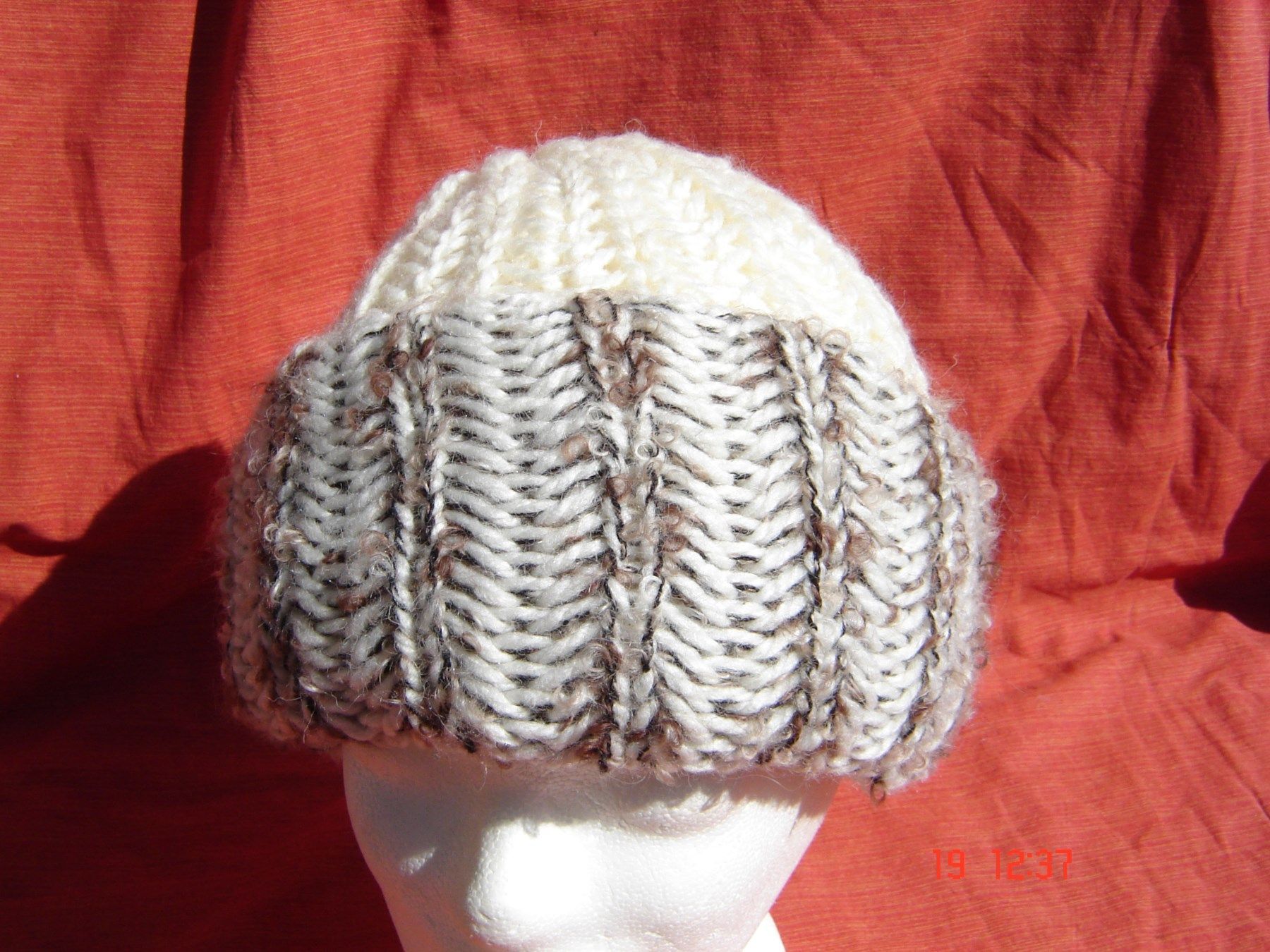 . chice oldstyle Wintermütze Strickmütze Umschlagmütze in Farbe naturweiß mit braun die Mütze ist sehr warm , da sie doppelt gestrickt ist und mit dem Umschlag hat man dann 4 Lagen um den Kopf herum aus 50% Wolle , 50% Polyacryl , Bitte Handwäsche Größe passend für 54 bis 57 cm Kopfumfang . Bitte se