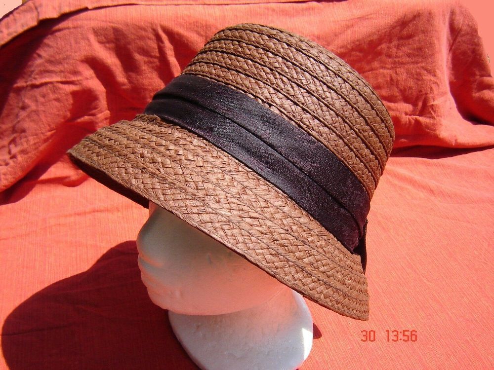 . Damenhut Strohhut sehr chicer Damen Sommerhut im FrühstückbeiTiffanystil Tulpenform , runter geschlagene Krempe und gerade Kopfform in Farbe schokobraun mit einem breiten Jacquard Band mit großer Schleife hinten der Hut ist aus Papier Borte genäht , sehr strapazierfähig und kann daher nicht breche