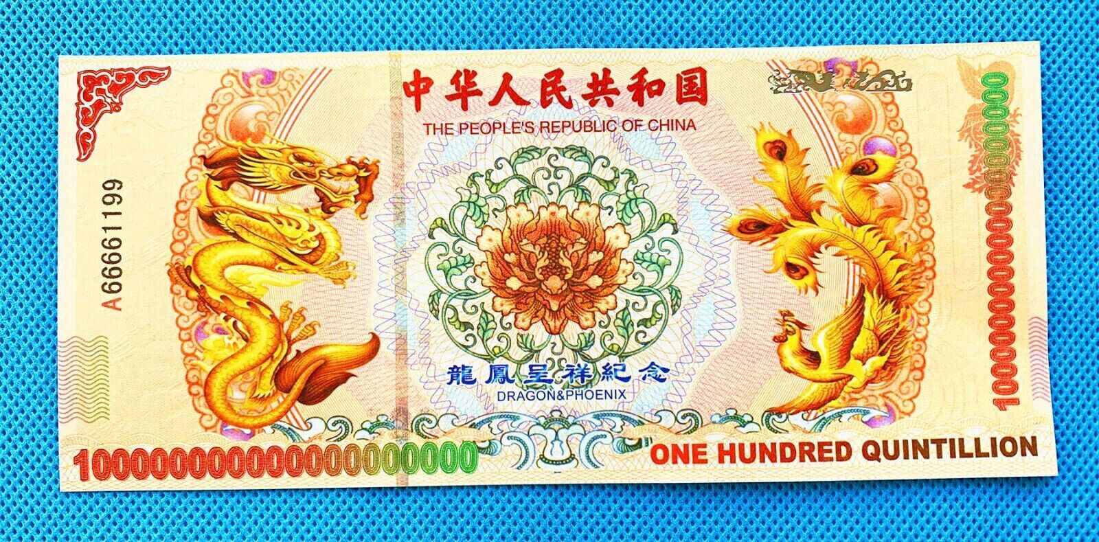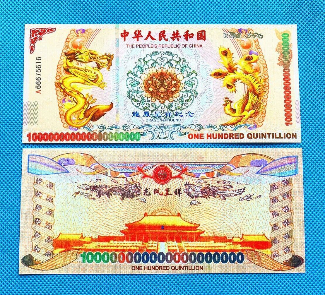 Banknote - China - unzirkuliert und Bankfrisch - sehr selten China Banknote 100 Quintillion Technische Information zum Artikel Die Seriennummern sind nicht identisch da jeder Schein eine andere hat, sie beginnt mit A669 Größe: ca. original Größe Erhaltung: Neu Verpackung: Folie Das ideale Geschenk o