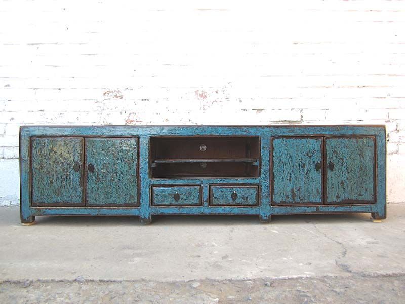 China cyanblaue TV Kommode Lowboard âEuroEuro Fér Flachbildschirm, Heavy Used Vintage Look. Ein Meisterwerk im asiatischen Vintage-Stil. Diese cyanblaue TV-Kommode im Heavy Used Vintage Look bringt lebendige Farbe und asiatischen Charme in Ihr Wohnzimmer und ist perfekt fér Flachbildschirme geeignet