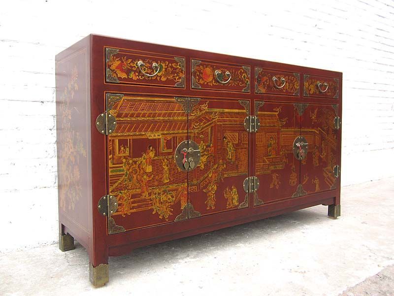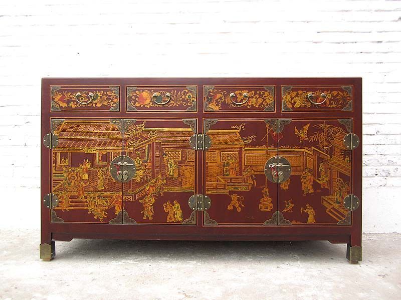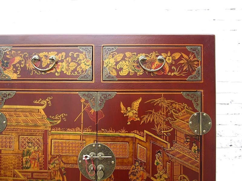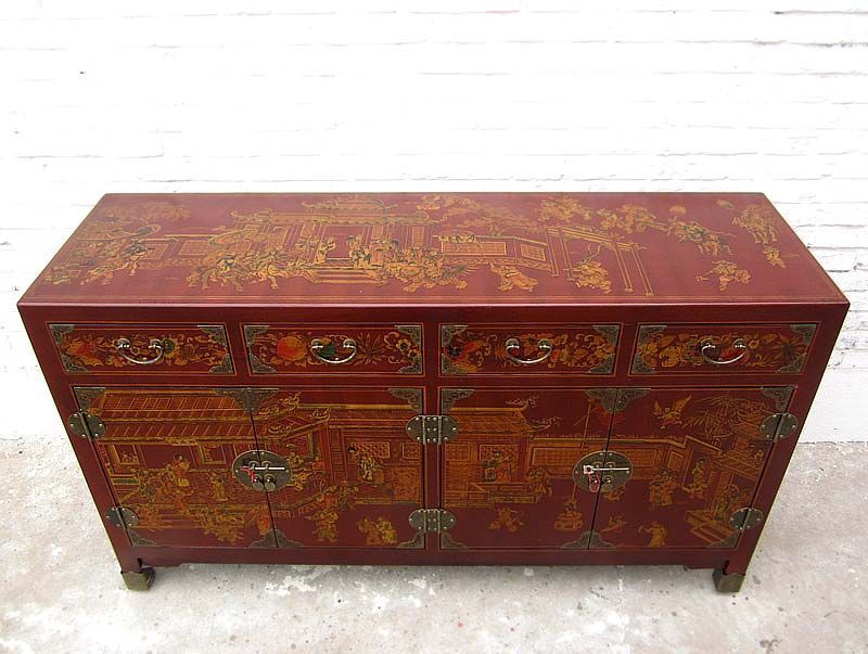 China Sideboard Kommode rotbraun Lederfinish Klassik Stil Holz