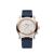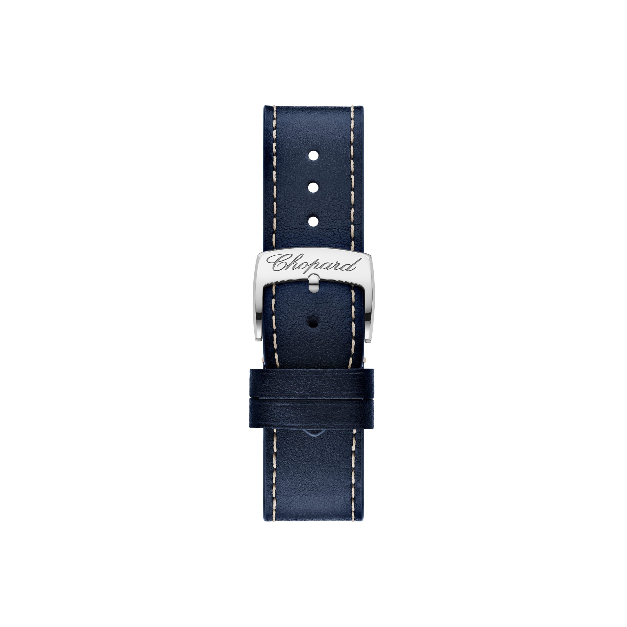 Marke: Chopard Referenz: 278615-6001 Geschlecht: Mann, Frau Aufzug: Automatik Zifferblattfarbe: Zifferblatt Roségold vergoldet mit Sonnenschliff Satiniertes Finish mit 7 schwebenden Diamanten Gehäusematerial: Stahl Armbandmaterial: Leder Produktionsjahr: 2024 Bandfarbe: Blau Verschluss: Widerhaken V