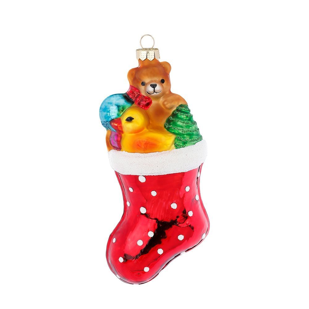 Christbaumschmuck Glas Weihnachtsstrumpf mit Teddybär / Ente 13cm rot