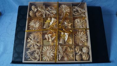 • Christbaumschmuck Herzen, Engel, Sterne, ca 50 Stück aus Stroh Holzkiste NEU OVP