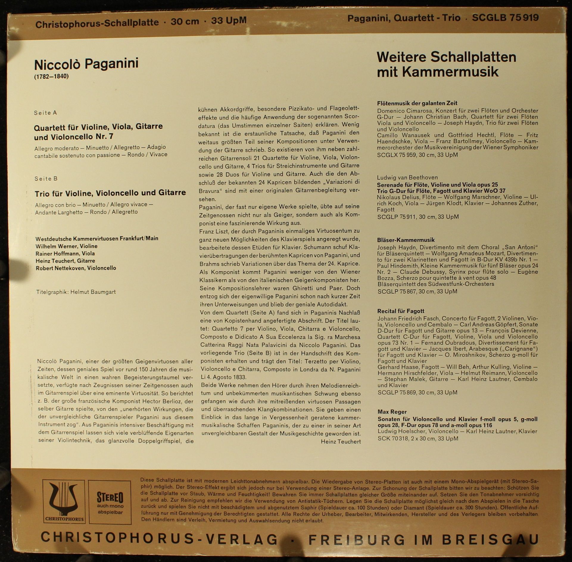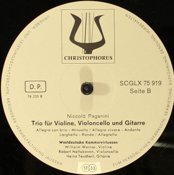 Condition Vinyl Near Mint (NM or M-) Condition Sleeve Near Mint (NM or M-) Tracks included: Quartett Für Violine, Viola, Gitarre Udn Violoncello Nr.7 I 1. > Allegro Moderato 2. > Minuetto Allegretto 3. > Adagio Cantabile Sostenuto Con Passione 4. > Rondo Vivace Trio Für Violine, Violonce