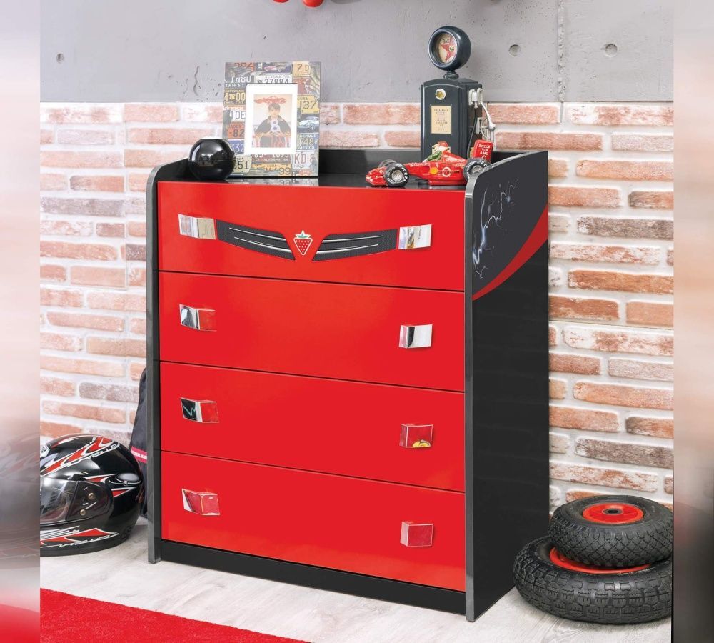 Cilek CHAMPION RACER Kommode Die Kommode aus der Serie CHAMPION RACER hat vier große Schubladen, in denen sich Kinderkleidung und Spielzeug perfekt verstauen lassen. Das Design des Rennwagens mit dem coolen Flammenmotiv passt perfekt zum Rest der Kollektion. Produktdetails: Kommode mit 4 großen Schu