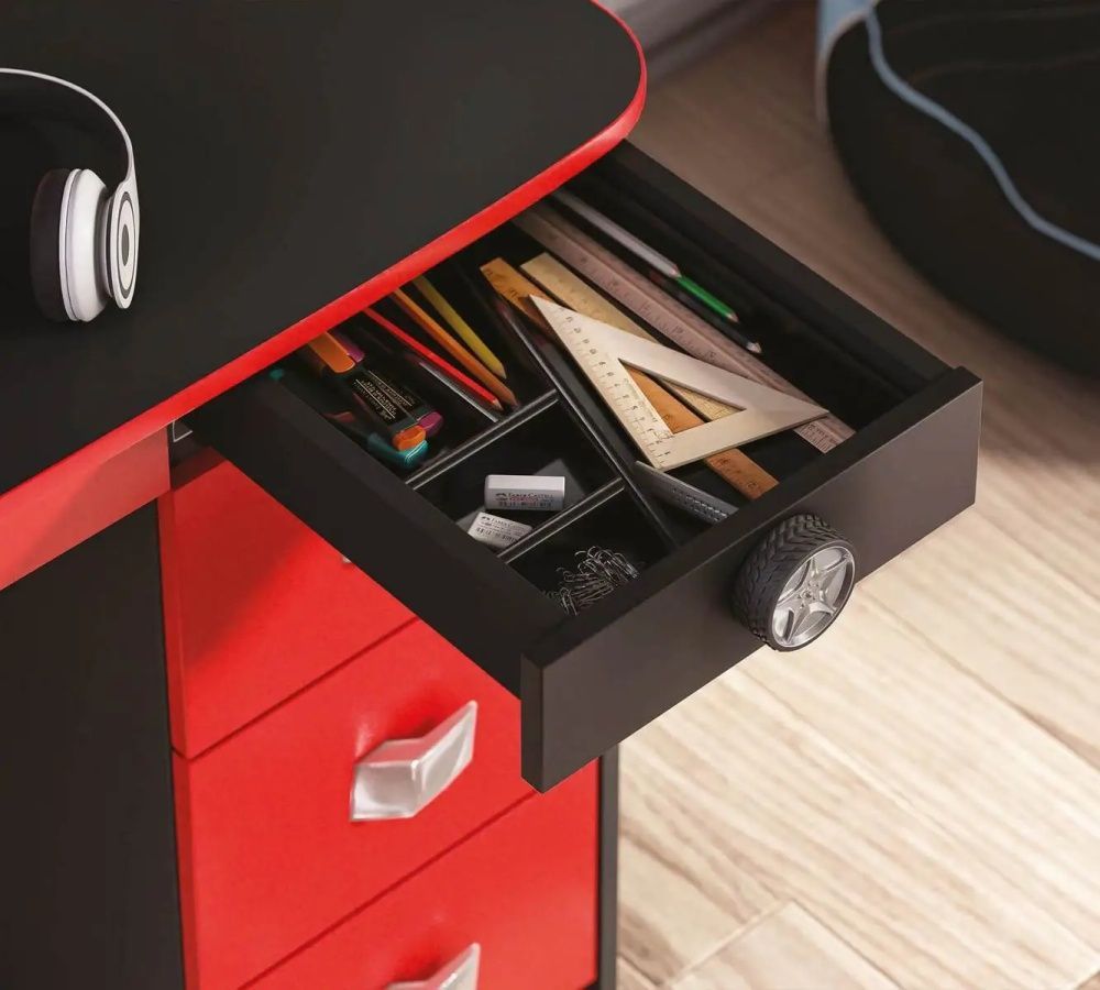 Cilek CHAMPION RACER Schreibtisch mit Aufsatz Noch nie waren Kinder so geschickt darin, ihre Hausaufgaben zu machen. An diesem CHAMPION RACER Schreibtisch macht das Arbeiten besonders viel Spaß. Es gibt viele coole Details, an denen sich Kinder erfreuen können: Beleuchtung, Rückspiegel, Griffe in Ra