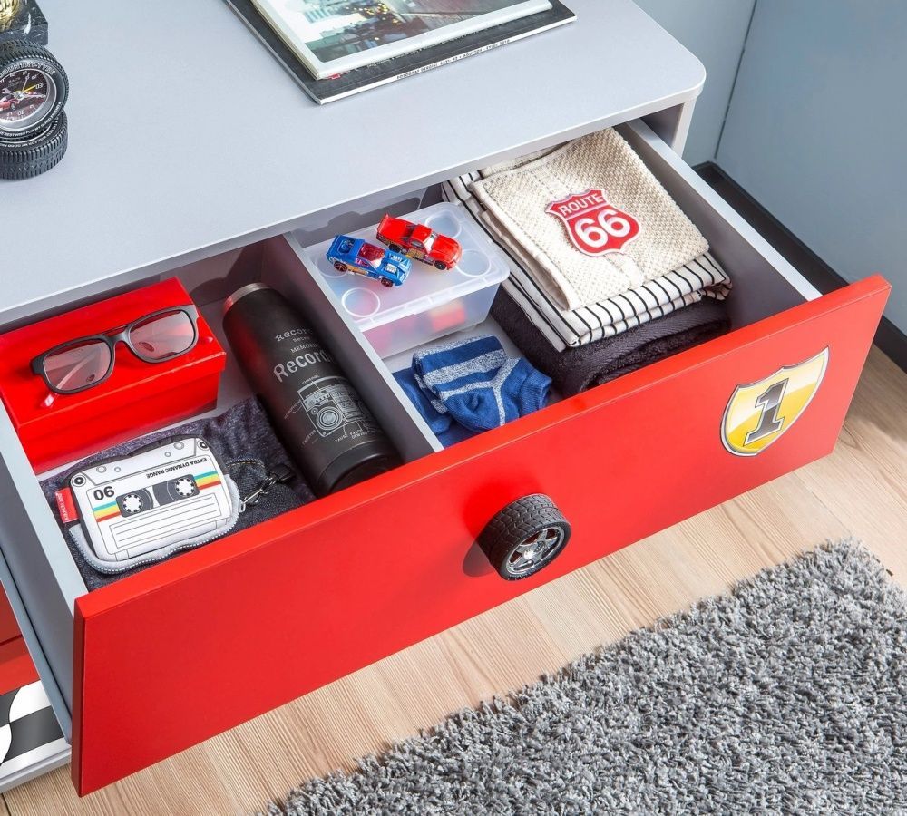 Cilek RACECUP Kommode Mit der Schubladenkommode von RACECUP fällt es den kleinen Rennfahrern leicht, Ordnung zu halten. In den großen Schubladen gibt es reichlich Stauraum für Utensilien, und die oberste Schublade hat mehrere Unterteilungen für eine bequemere Nutzung. Coole Motive und realistische G