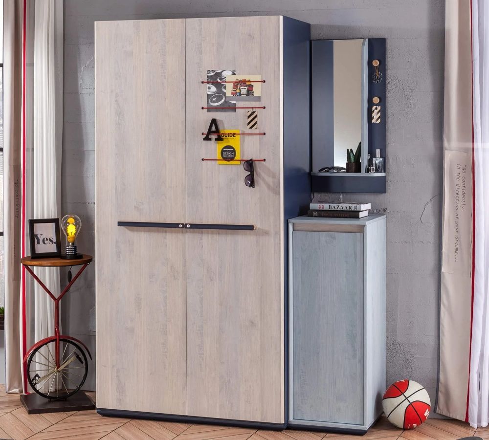 Cilek TRIO kleiner Schrank mit Tür Regal Das blaugraue, zeitlos moderne und grifflose Schränkchen TRIO von Cilek bietet als Ergänzung zum Kleiderschrank drei großzügige Ablagefächer, um Kleidung, Schuhe oder andere Gegenstände zu aufbewahren. 1 x Trio kleiner Schrank mit Tür: Schrank in Blautönen un