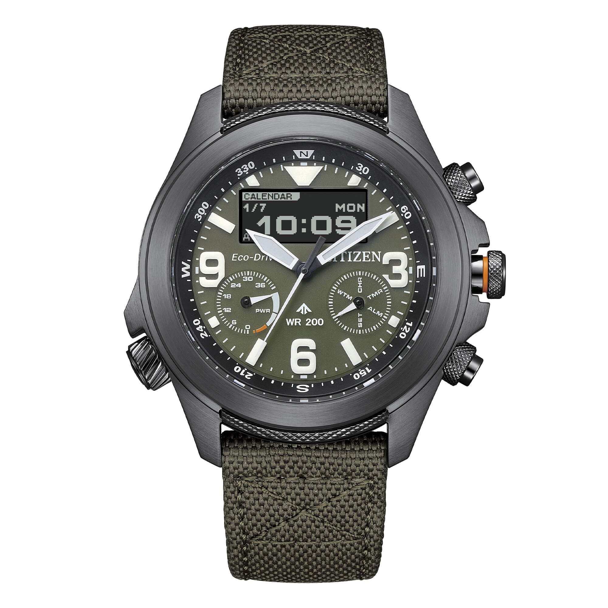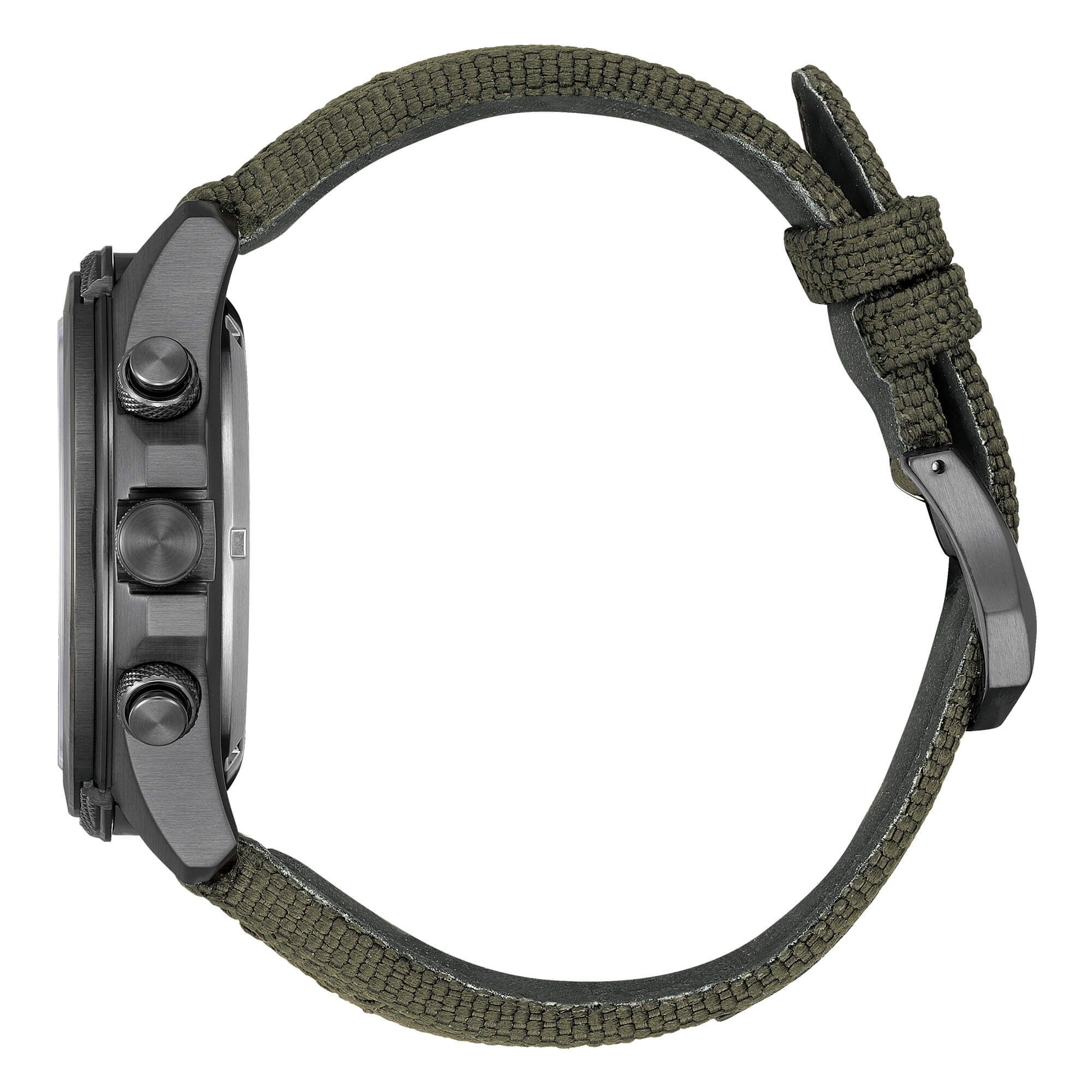 Marke: Citizen Referenz: JV1005-02W Geschlecht: Herren Belastbarkeit: Eco Drive Zifferblattfarbe: Grün Gehäusematerial: Stahl Bandmaterial: Nylon Produktionsjahr: 2024 Bandfarbe: Grün Verschluss: Klebeverschluss mit Widerhaken Verschlussmaterial: Stahl Gehäusedurchmesser: 44,00 mm Gehäusehöhe: 14 mm