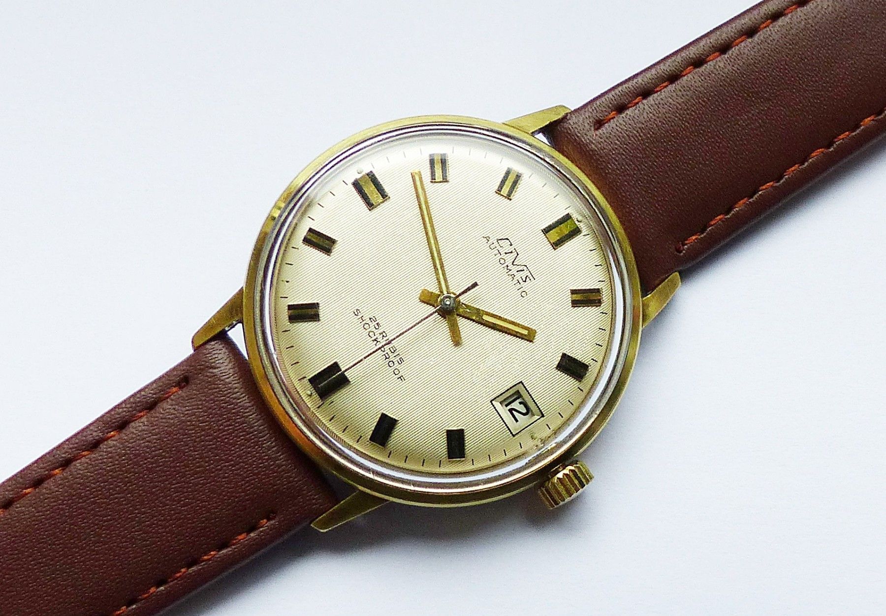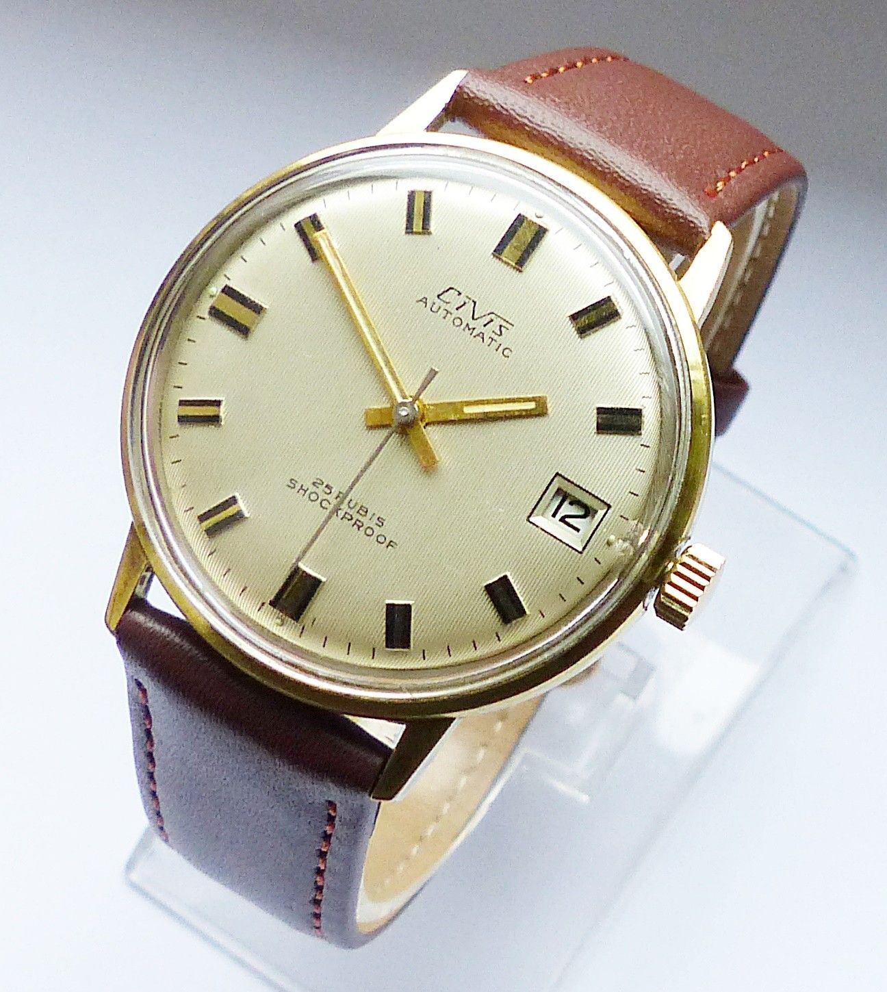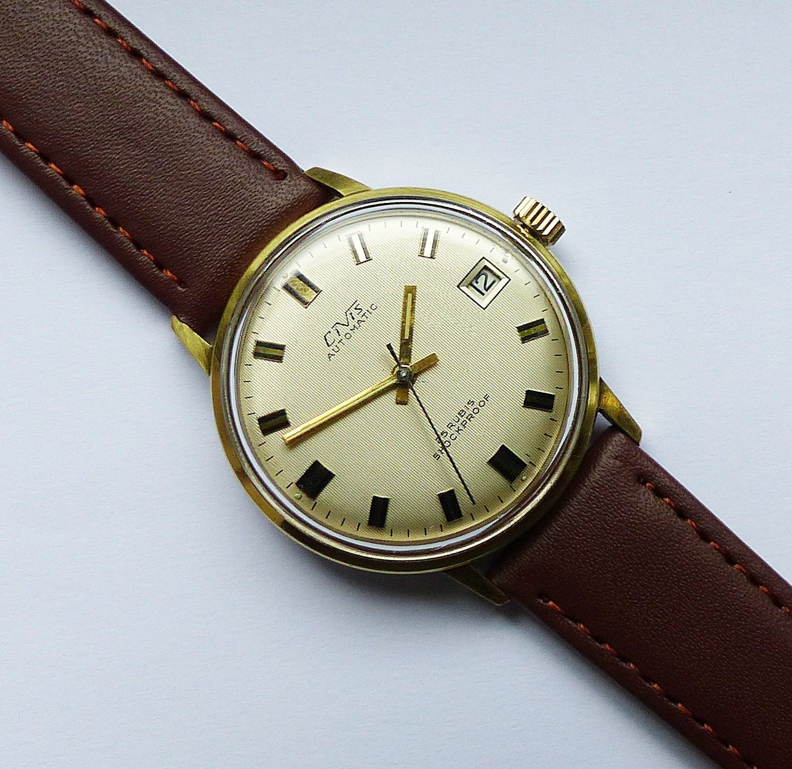 Schöne CIVIS Automatic Calendar mit Goldenem Zifferblatt und aufgesetzten Gold-Schwarzen Strichindexen, grosser zentraler Sekunde, Datum bei 3.00 Uhr. Die Uhr ist voll funktionsfähig und in sehr guten Zustand s. Fotos Hersteller Civis ( Richard Fessler ) Pfortsheim Deutschland Maße Gehäuse : 35mm x