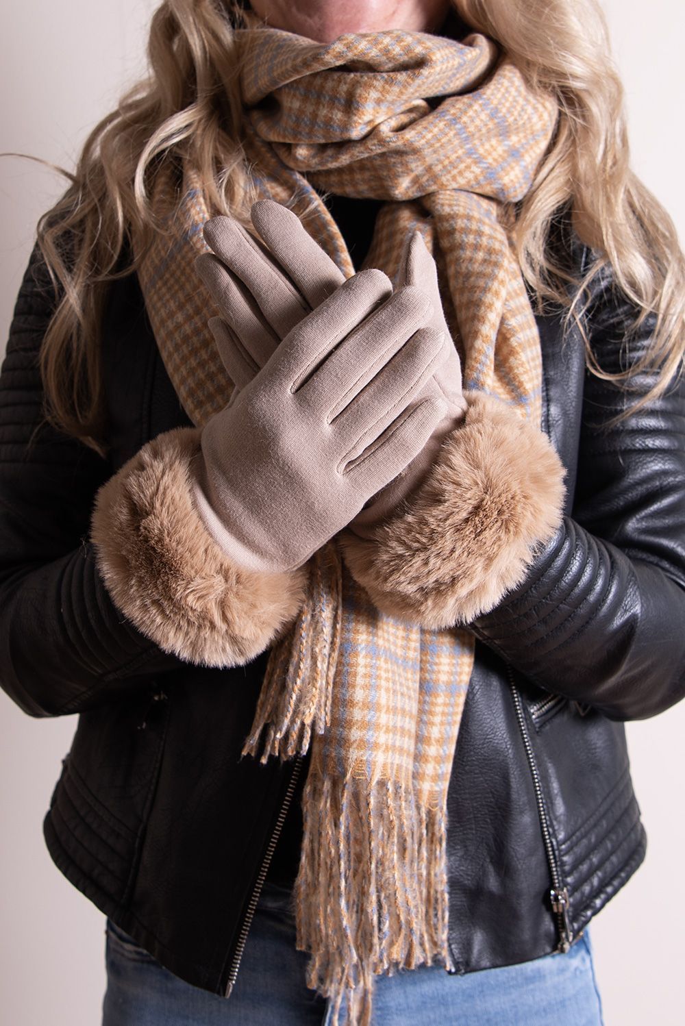 Clayre & Eef Handschuhe mit Kunstpelz 8x24 cm Beige Baumwolle