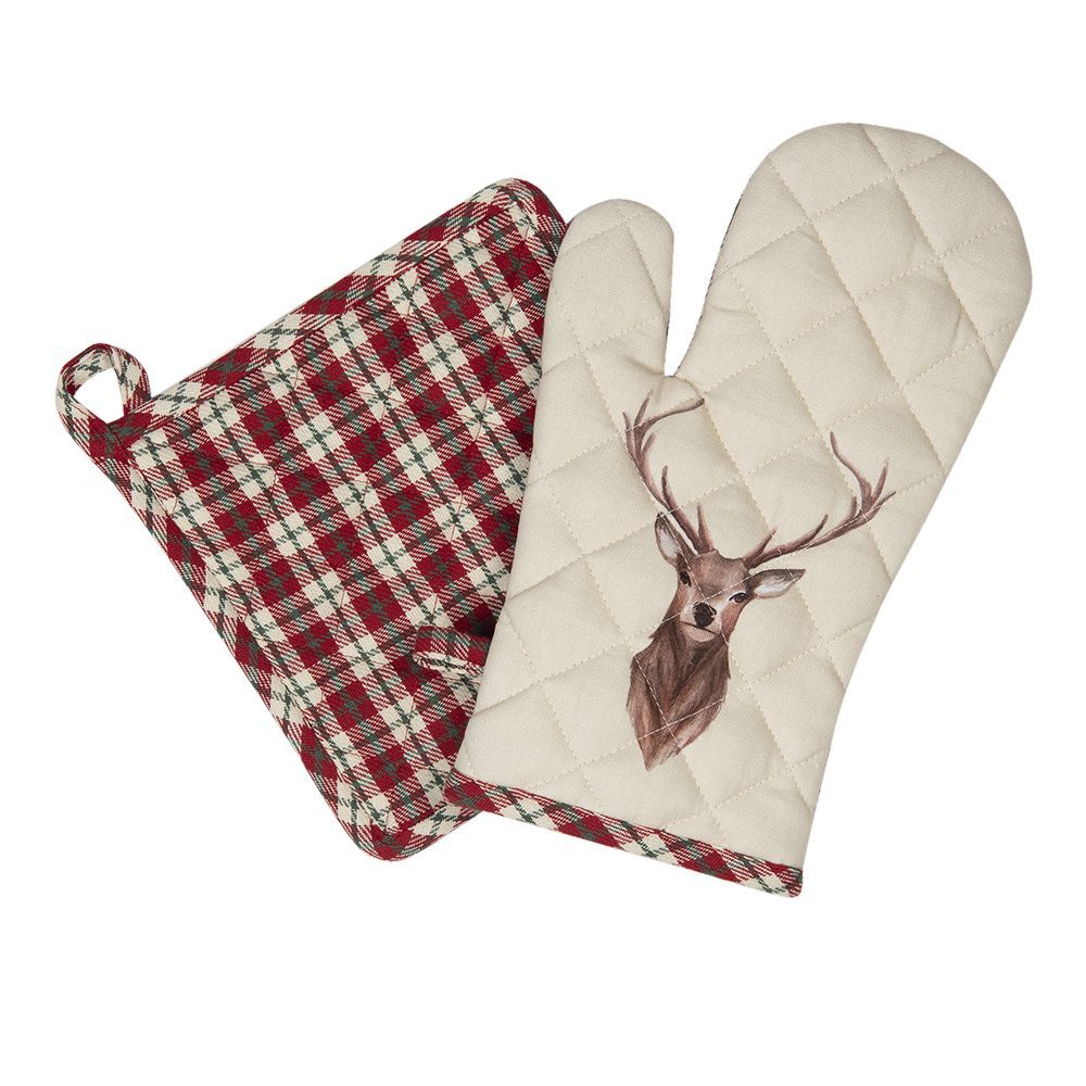Clayre & Eef Clayre & Eef Ofenhandschuh 18x30 cm Beige Rot Baumwolle Hirsch