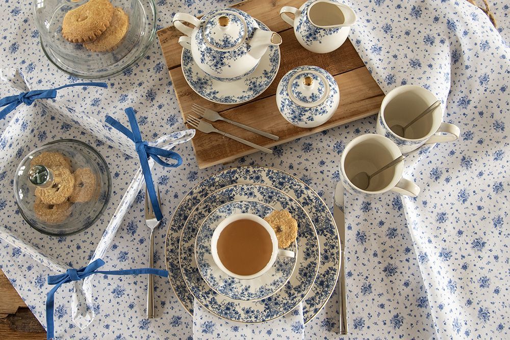 Clayre & Eef Clayre & Eef Tischläufer 50x140 cm Weiß Blau Baumwolle Rosen (Gr. 50x140 cm)