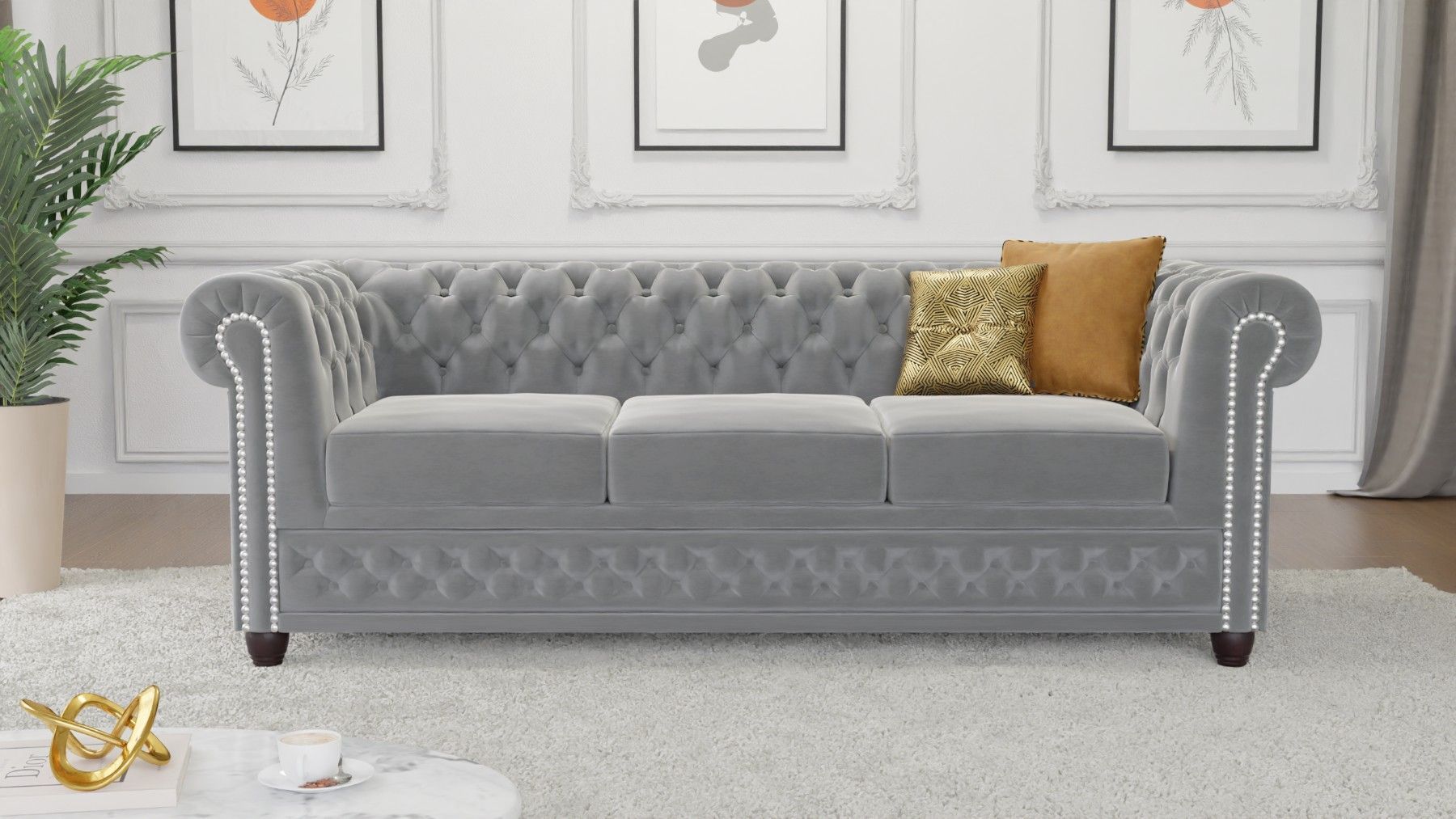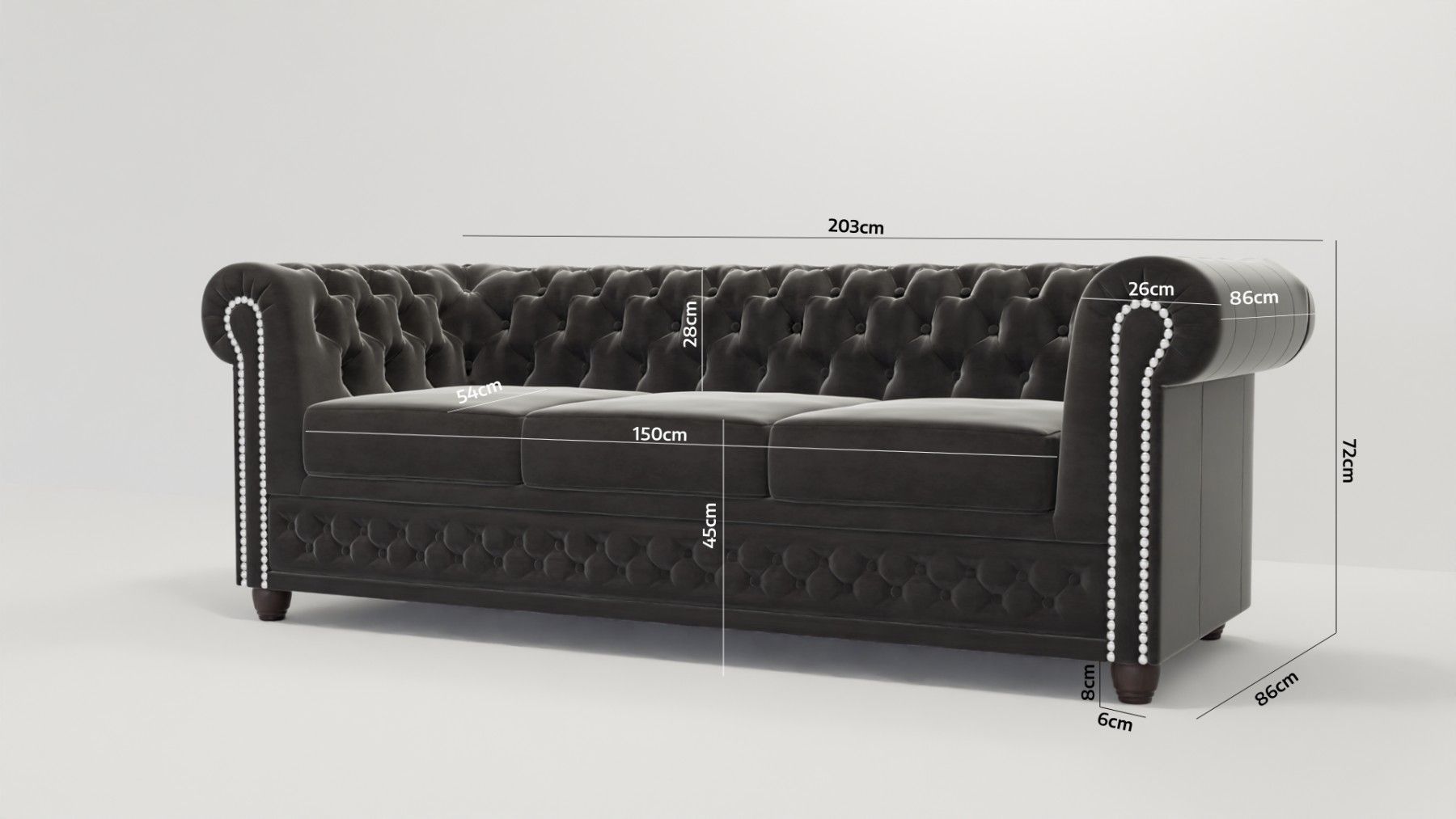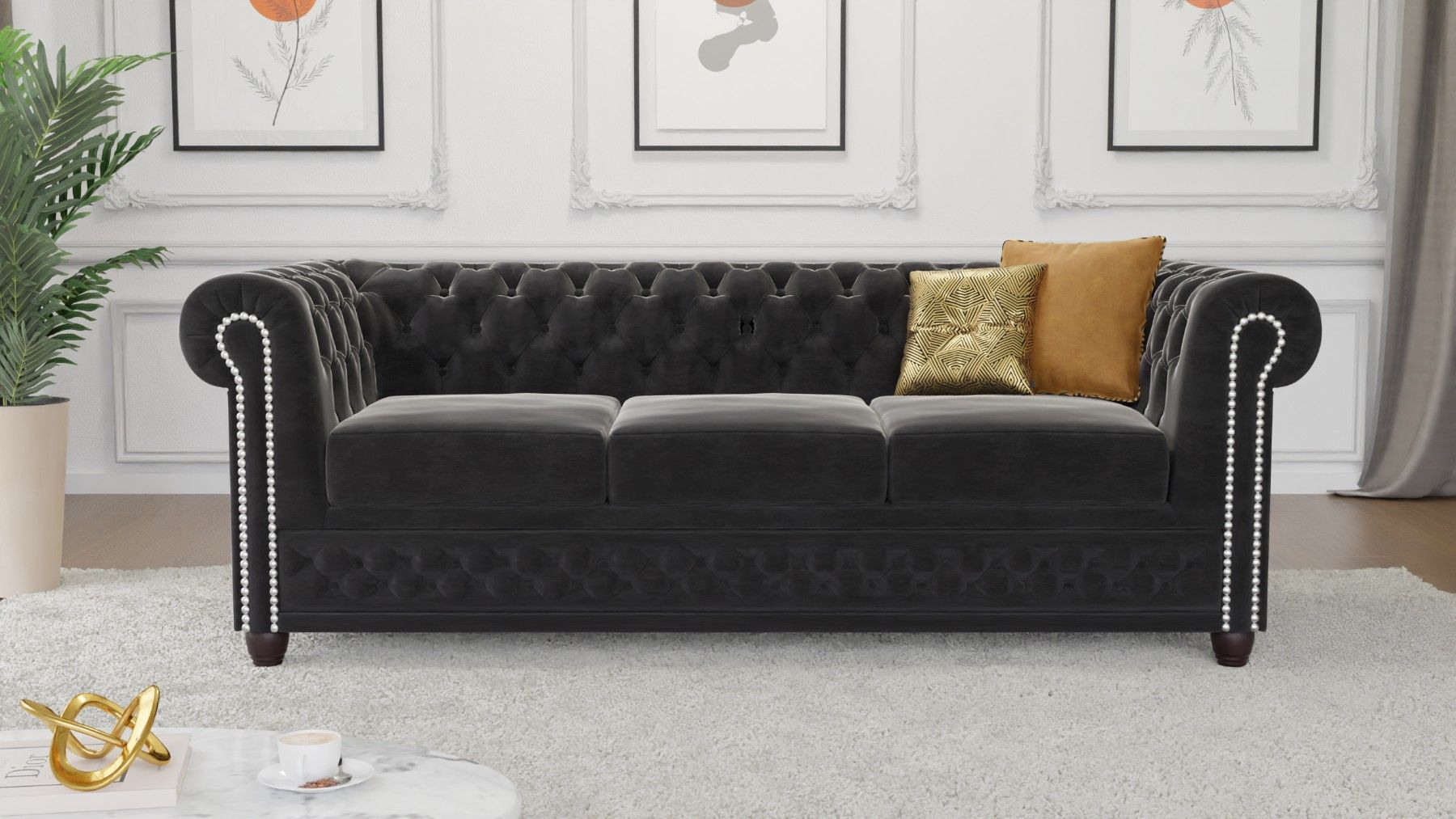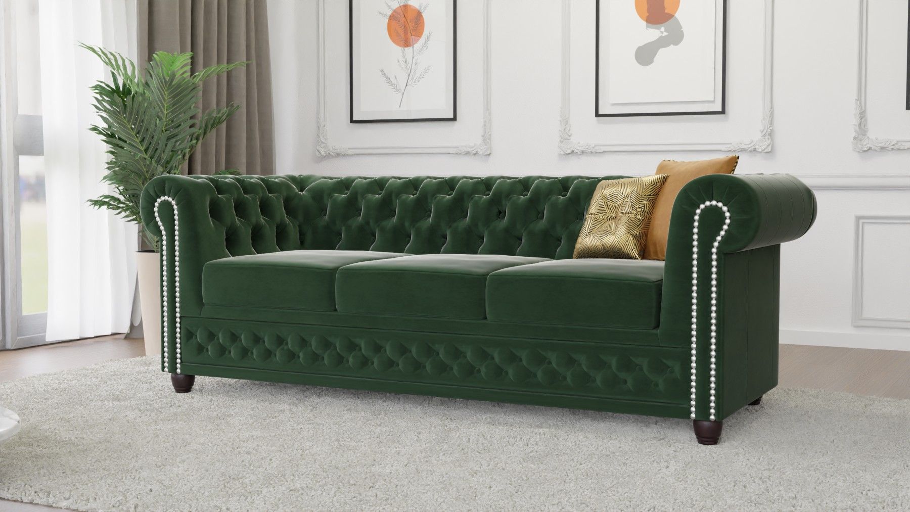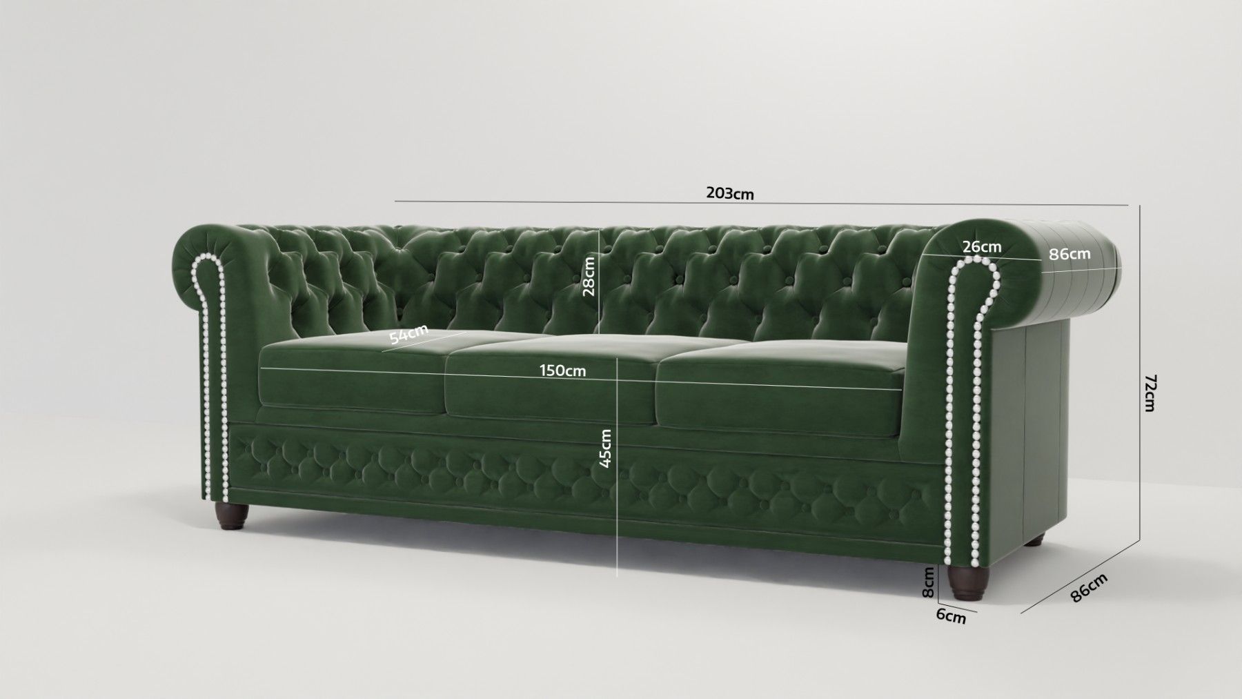 Cleo - Chesterfield 3 sitzer Sofa aus Samt-Stoff mit Holzfüßen