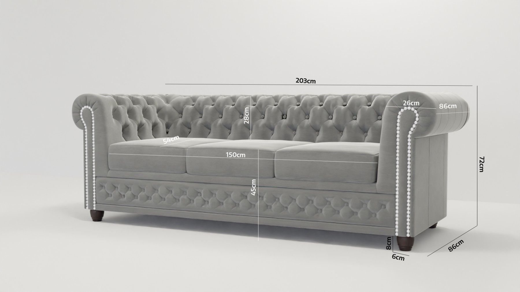 B 203 cm x T 86 cm x H 72 cm