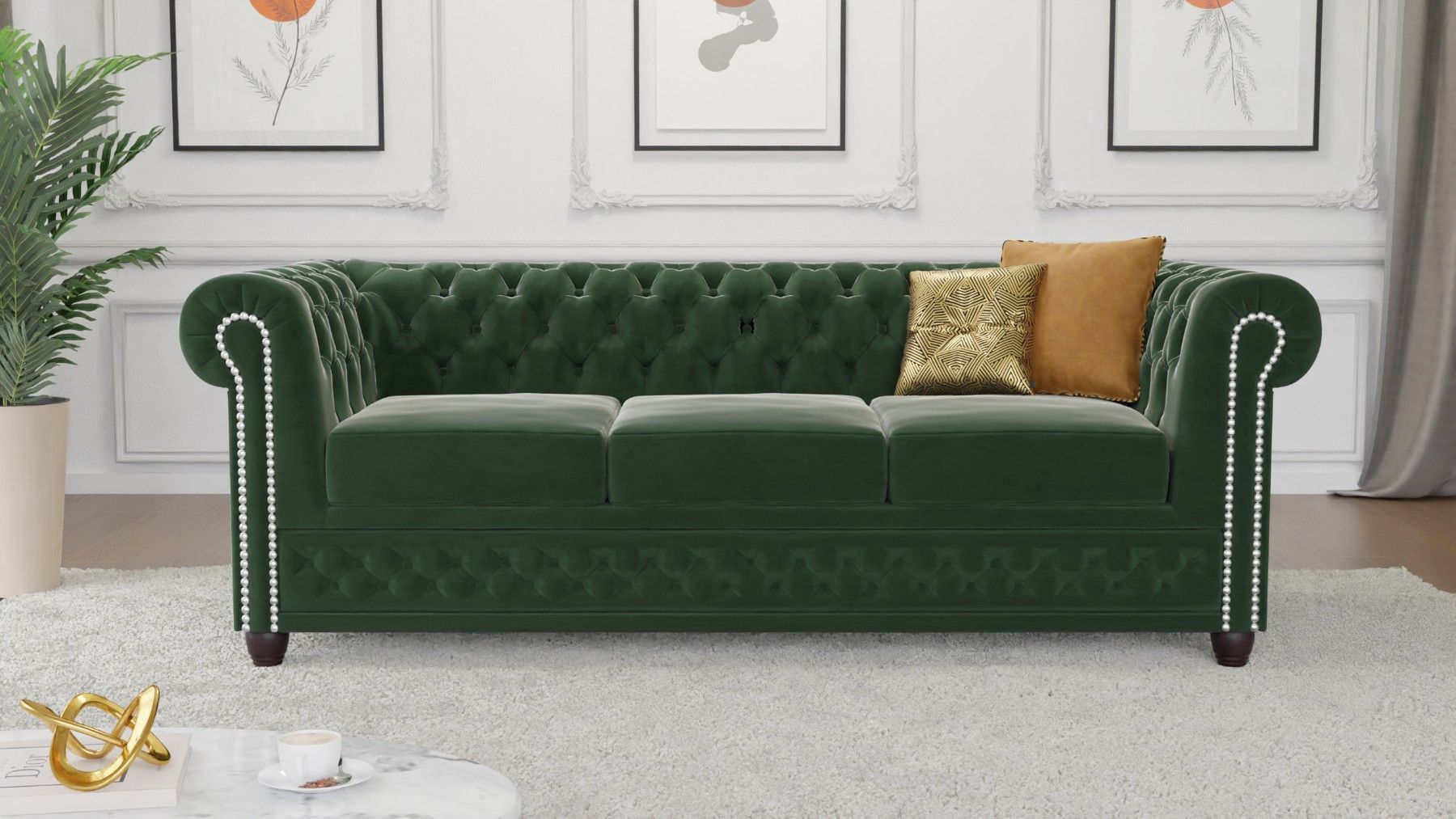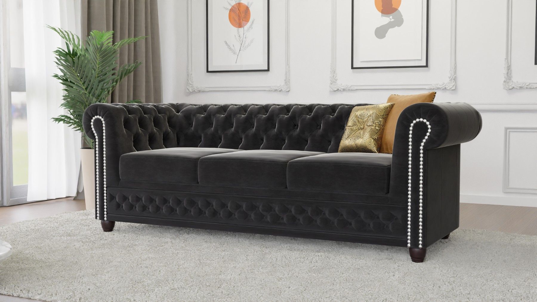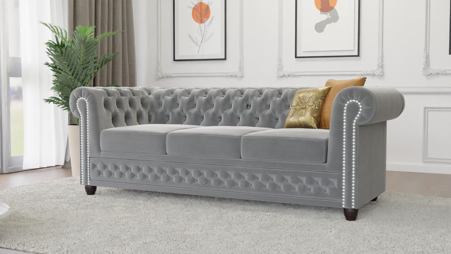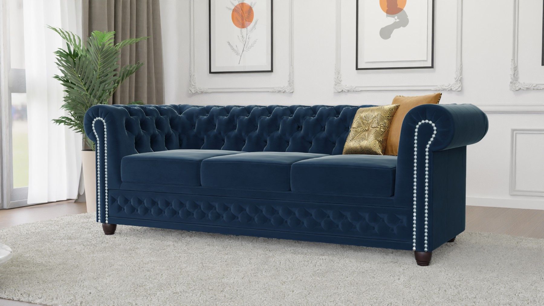 Cleo - Chesterfield 3 sitzer Sofa mit Schlaffunktion aus Samt-Stoff mit Holzfüßen