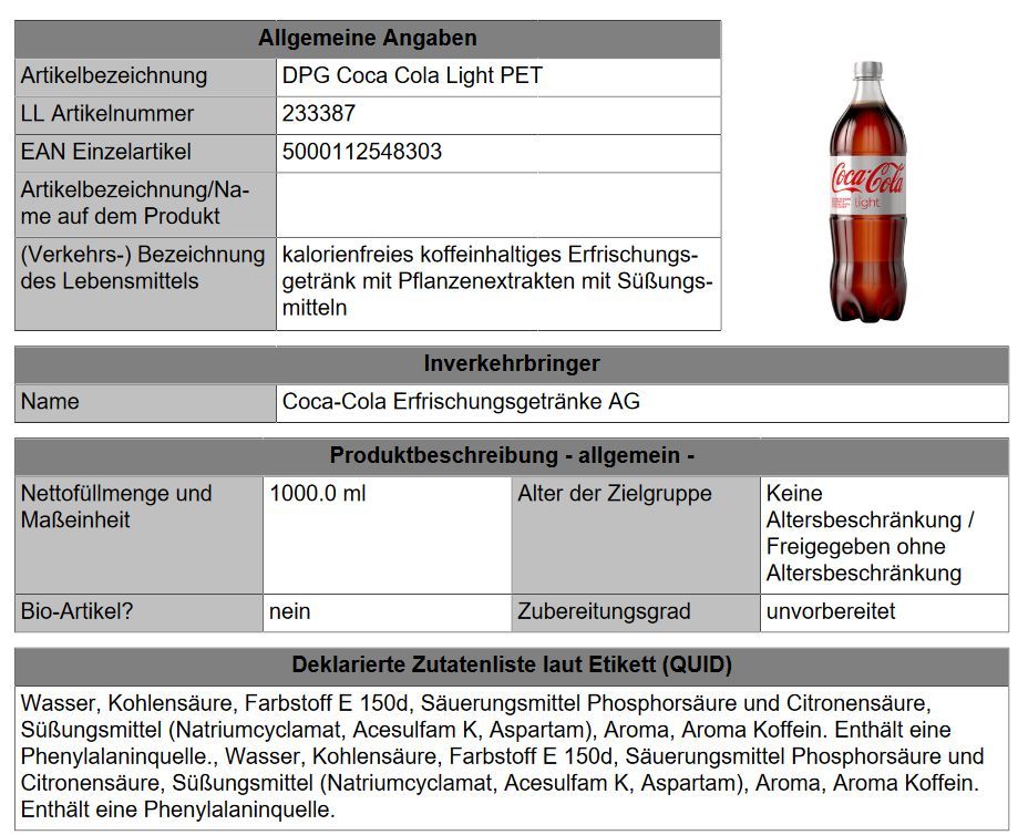 Coca Cola Light 12x1.00l Fl., Einweg-Pfand