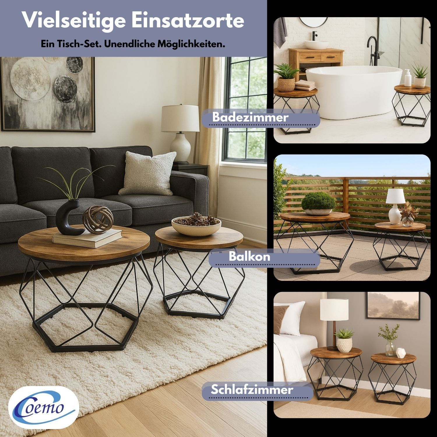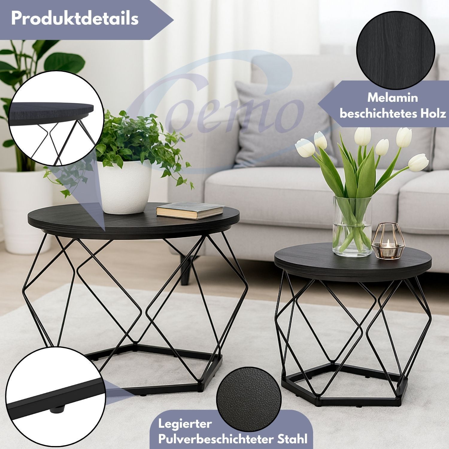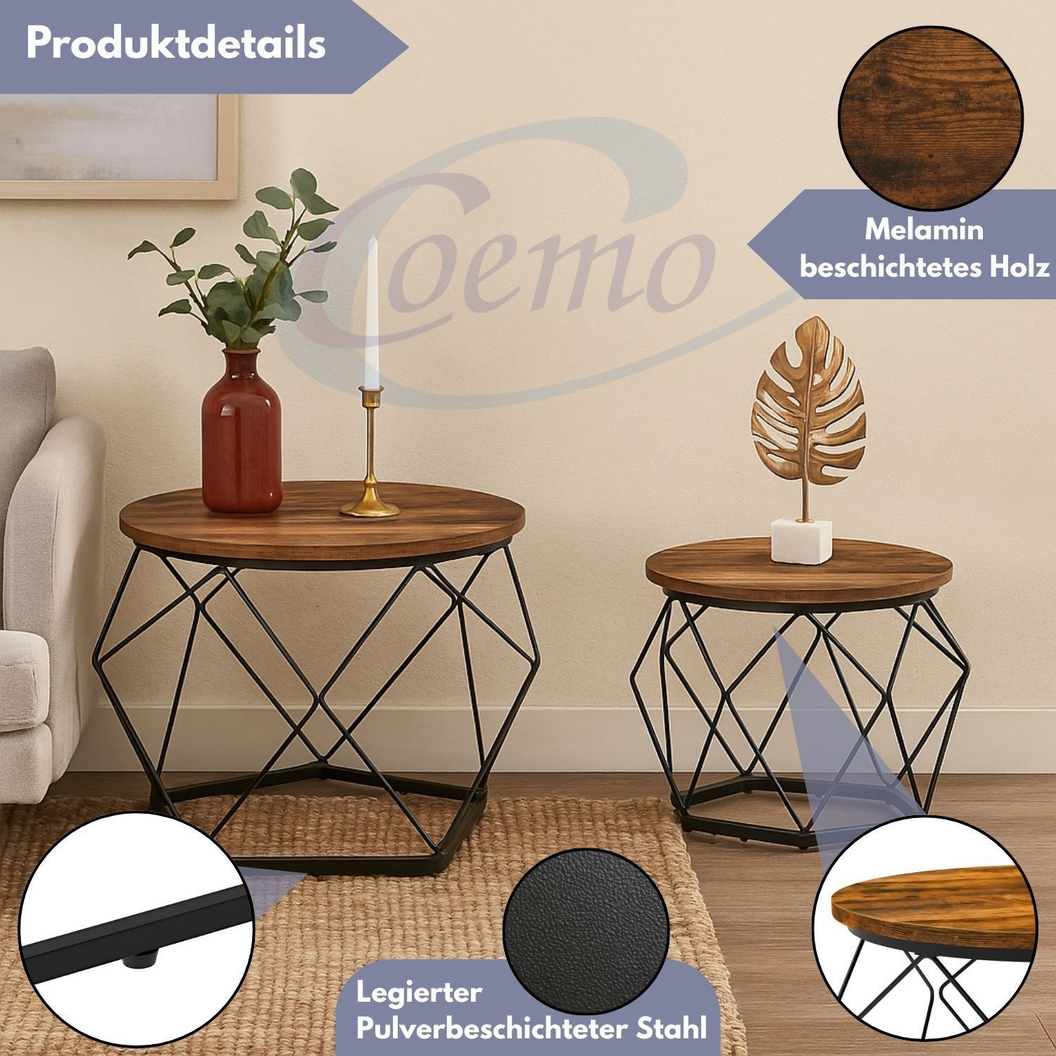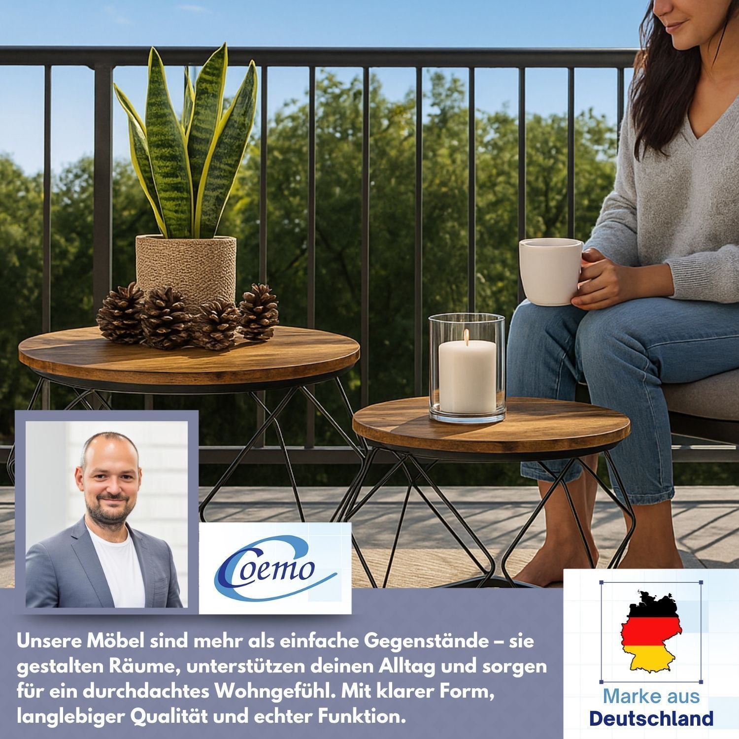 Coemo Couchtisch Duett – Stil & Funktion im Doppelpack Das Coemo Couchtisch Duett 2er Set kombiniert modernes Industriedesign mit natürlicher Eleganz und wird zum vielseitigen Hingucker in Ihrem Zuhause. Mit runden Tischplatten in warmer Holzoptik oder elegantem Schwarz und einem filigranen Meta