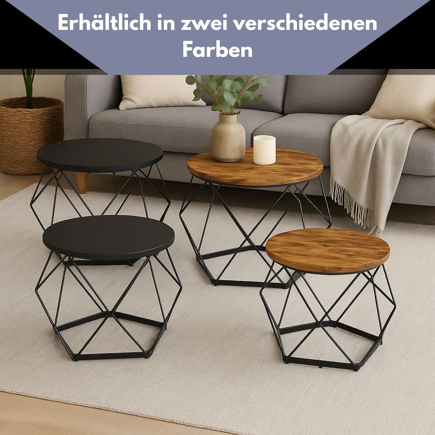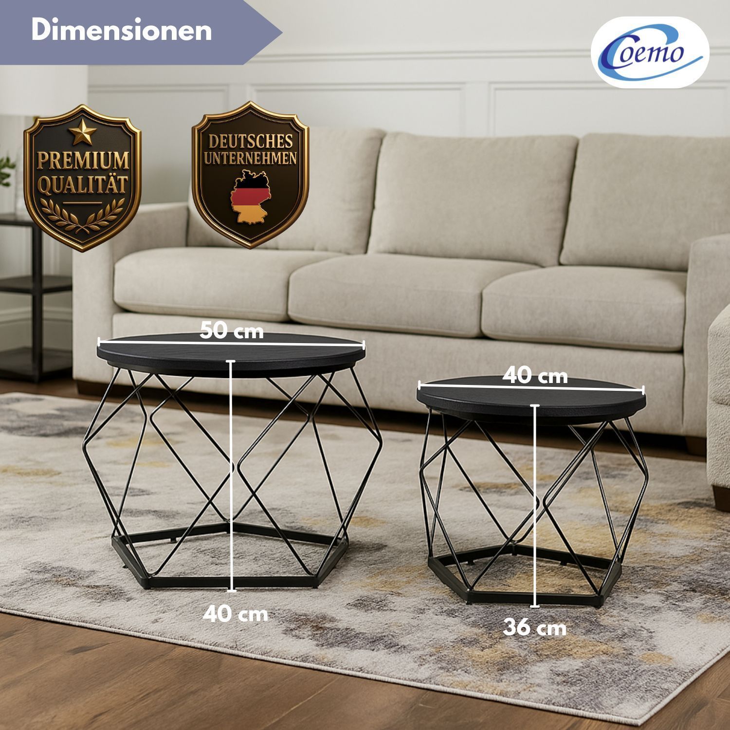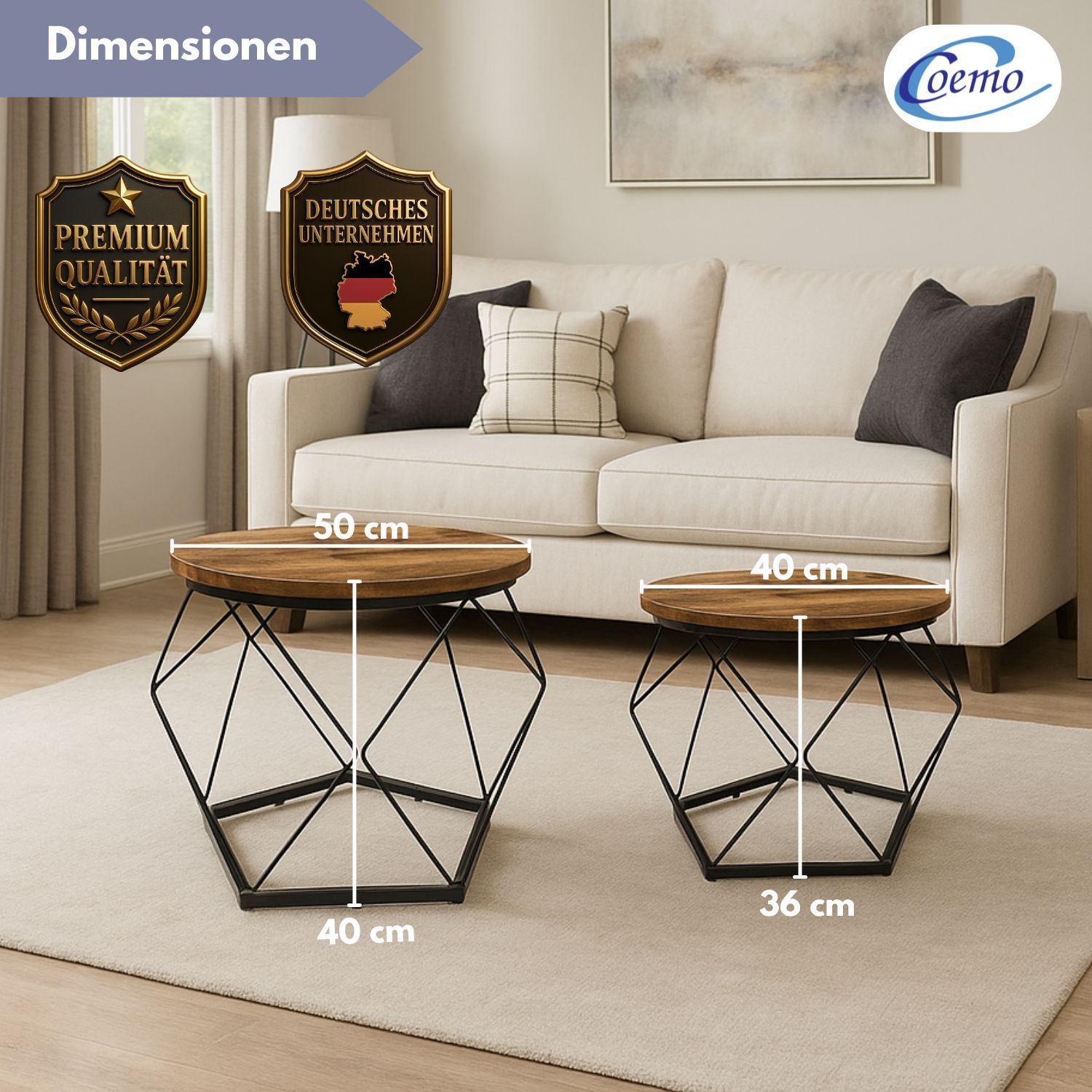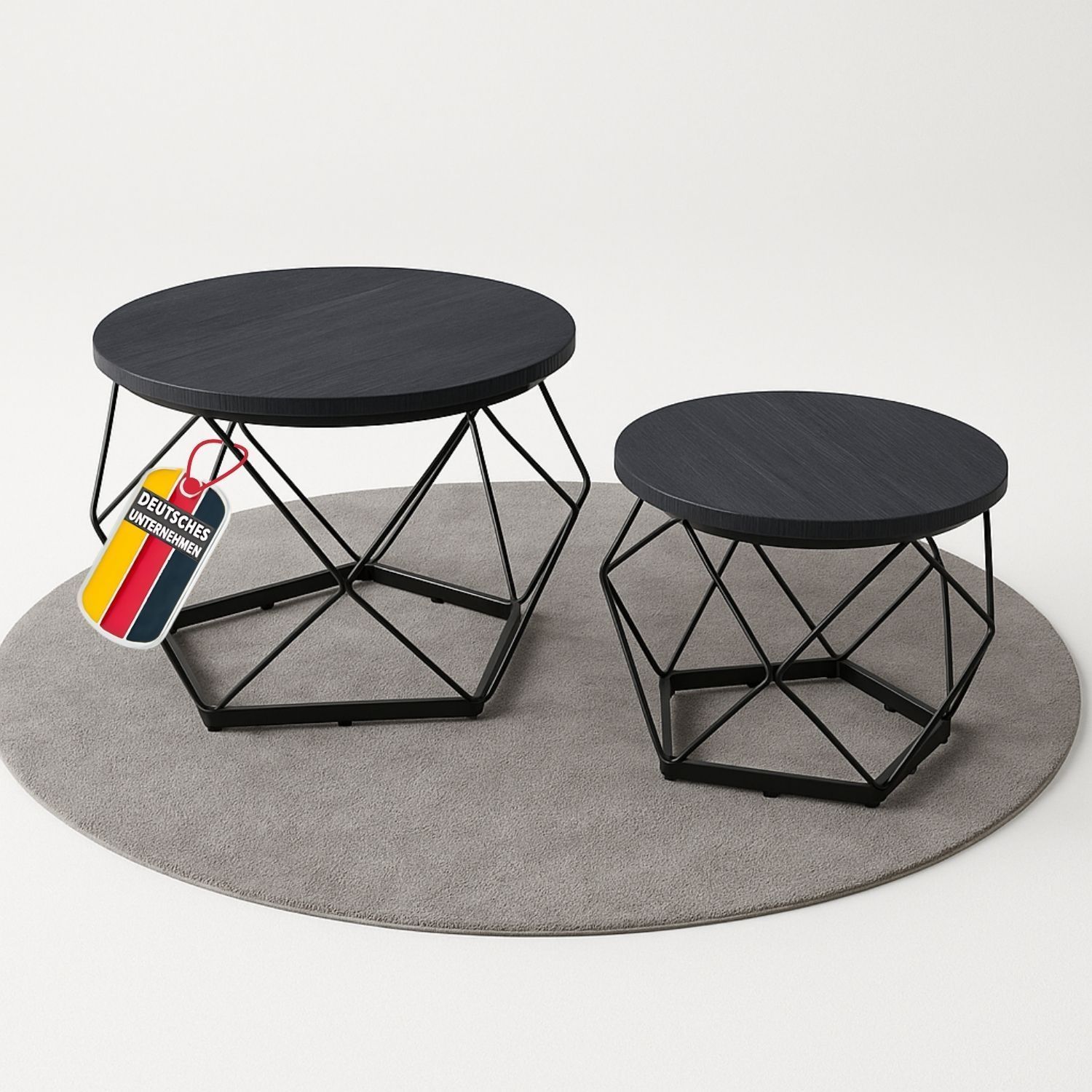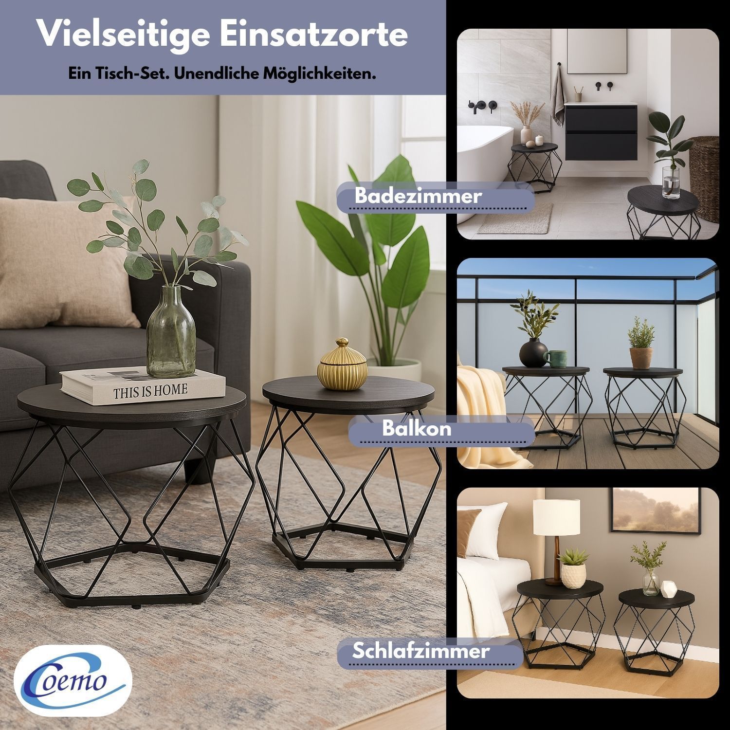 Coemo Couchtisch Duett – Stil & Funktion im Doppelpack Das Coemo Couchtisch Duett 2er Set kombiniert modernes Industriedesign mit natürlicher Eleganz und wird zum vielseitigen Hingucker in Ihrem Zuhause. Mit runden Tischplatten in warmer Holzoptik oder elegantem Schwarz und einem filigranen Meta