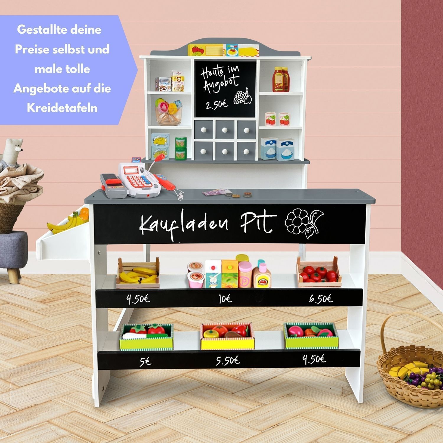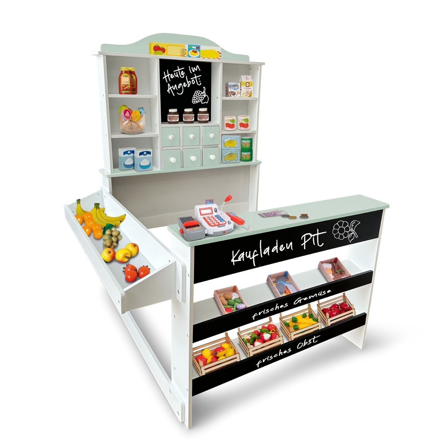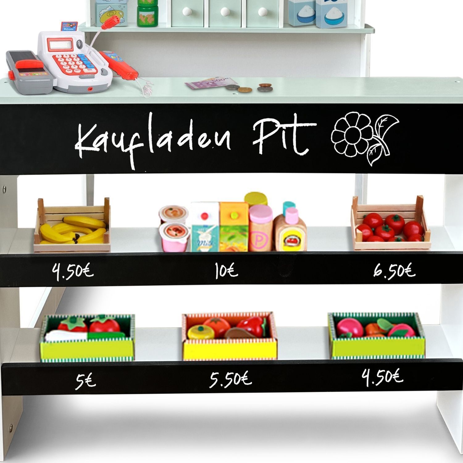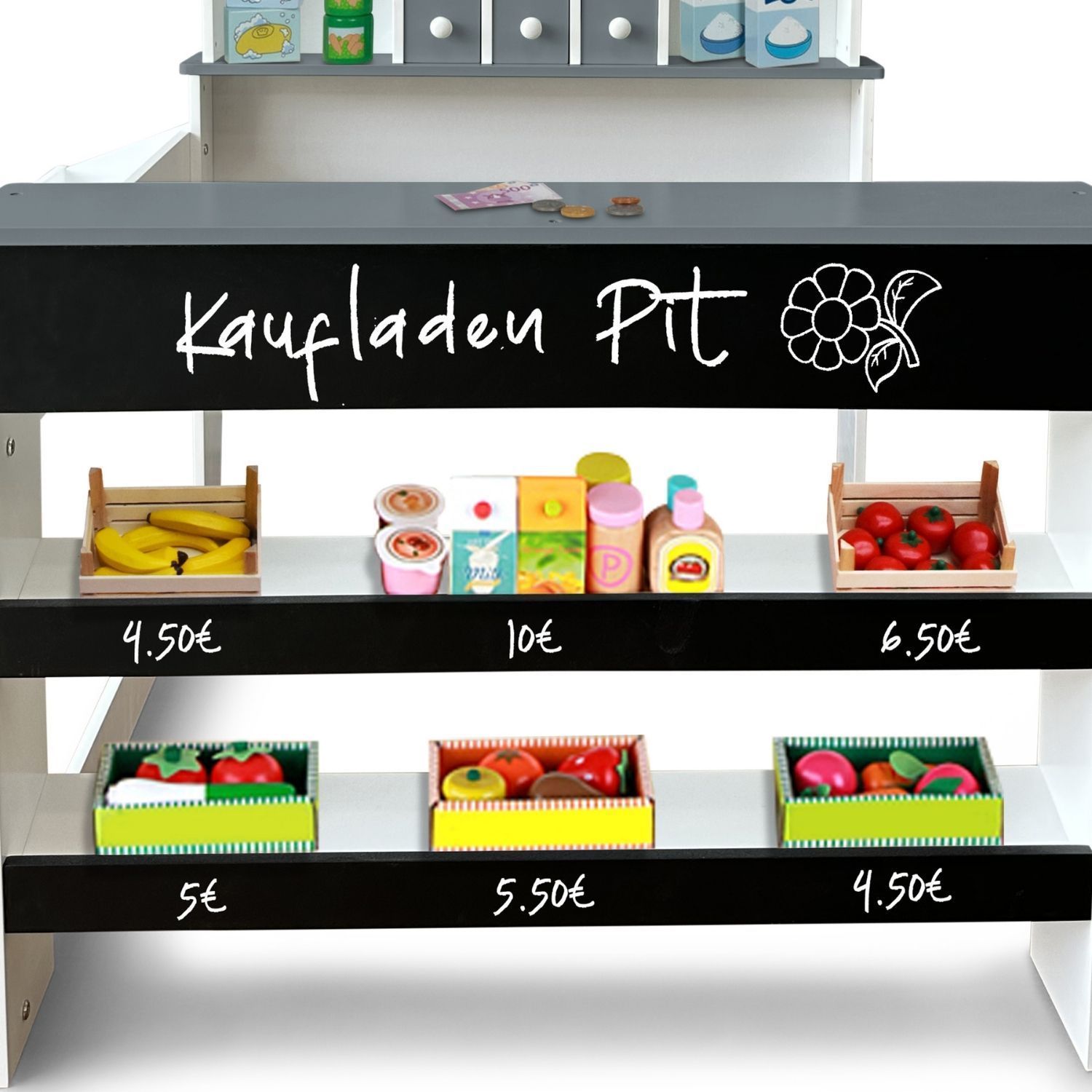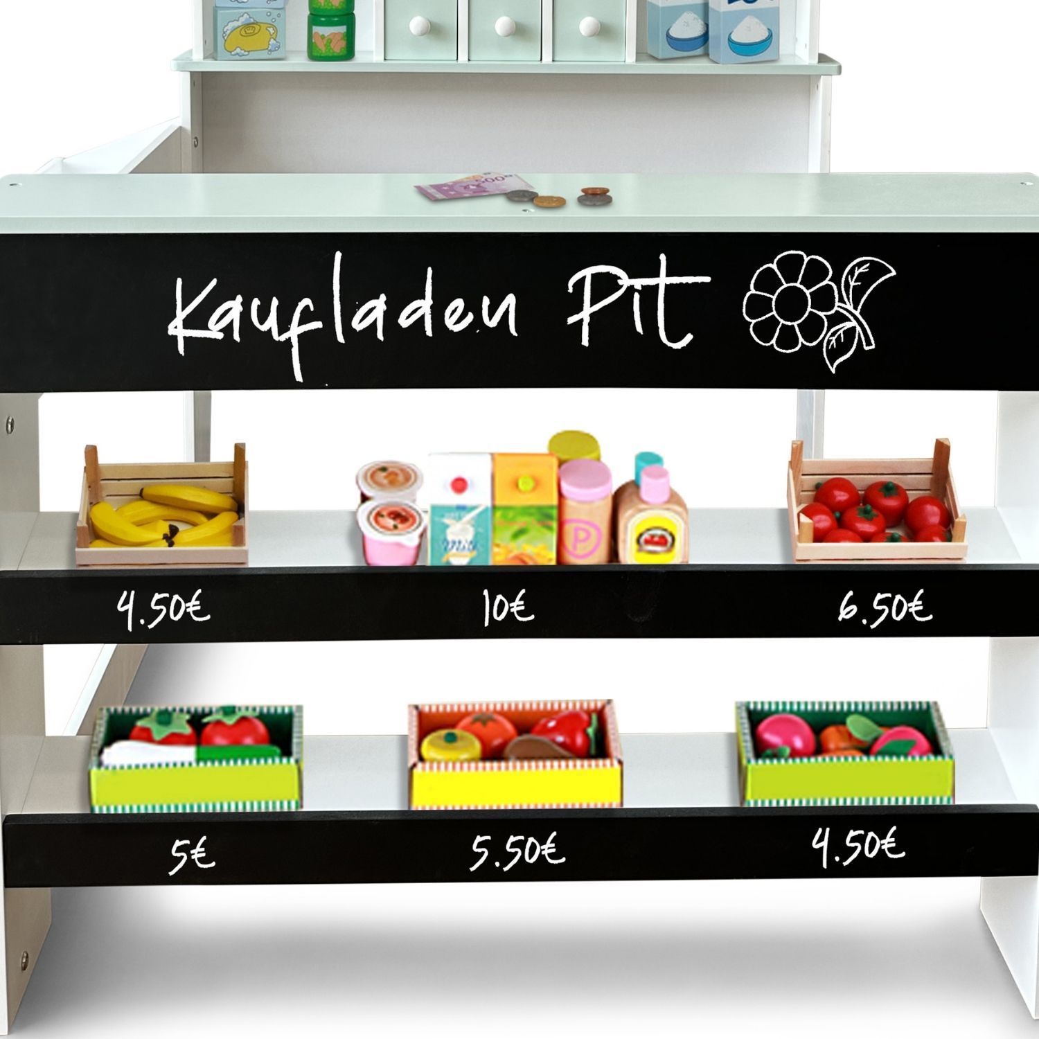 Coemo Kaufladen Pit aus Holz mit Preisschildern, wahlweise mit Spielkasse Linus